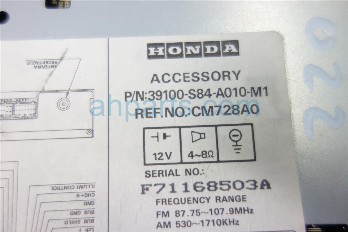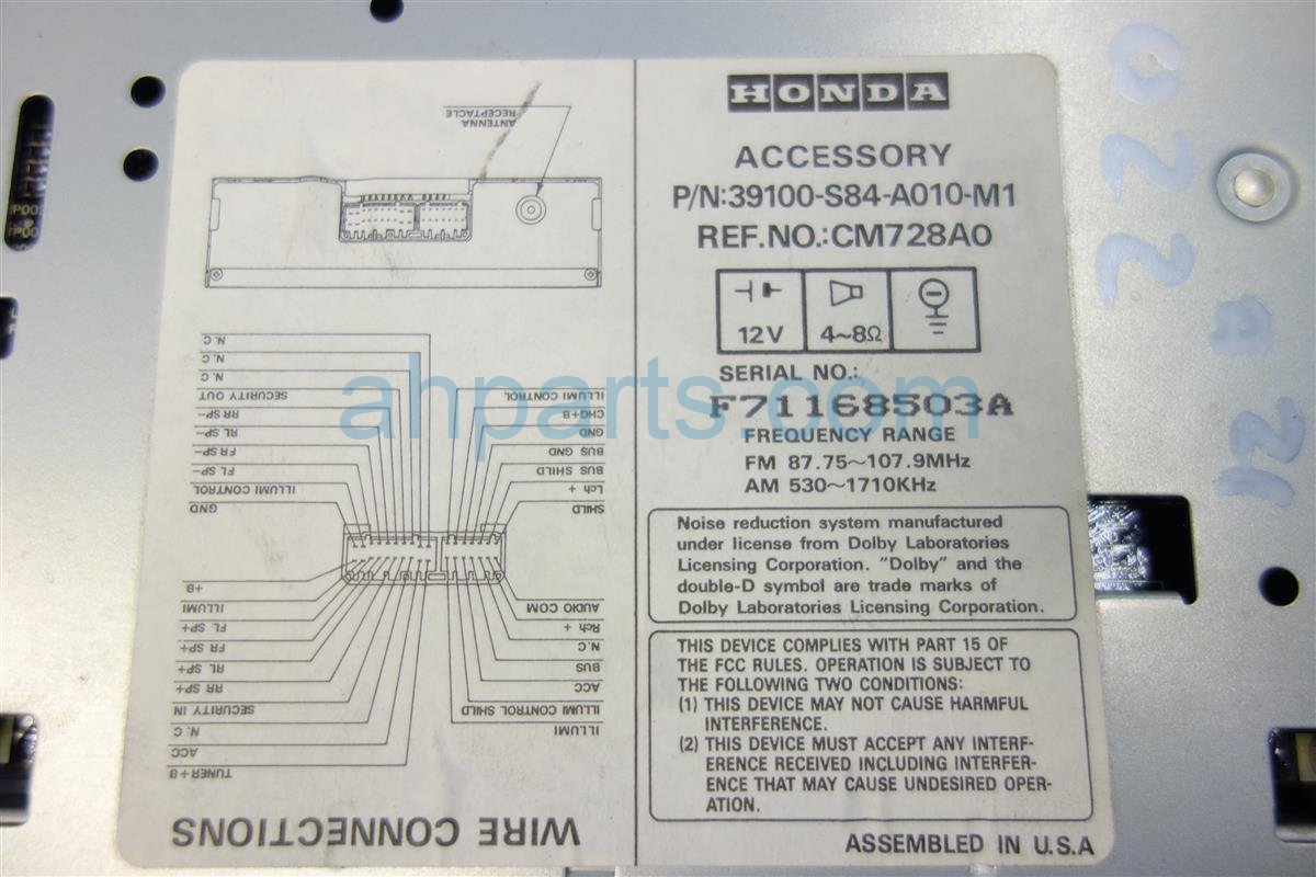1998 Honda Accord am/fm/cd radio, tested good is a used item with a 1 year warranty. This OEM replacement am/fm/cd radio, tested good is genuine and has part numbers 39100-S84-A01, and 39100S84A01. This Honda part sells for $49.