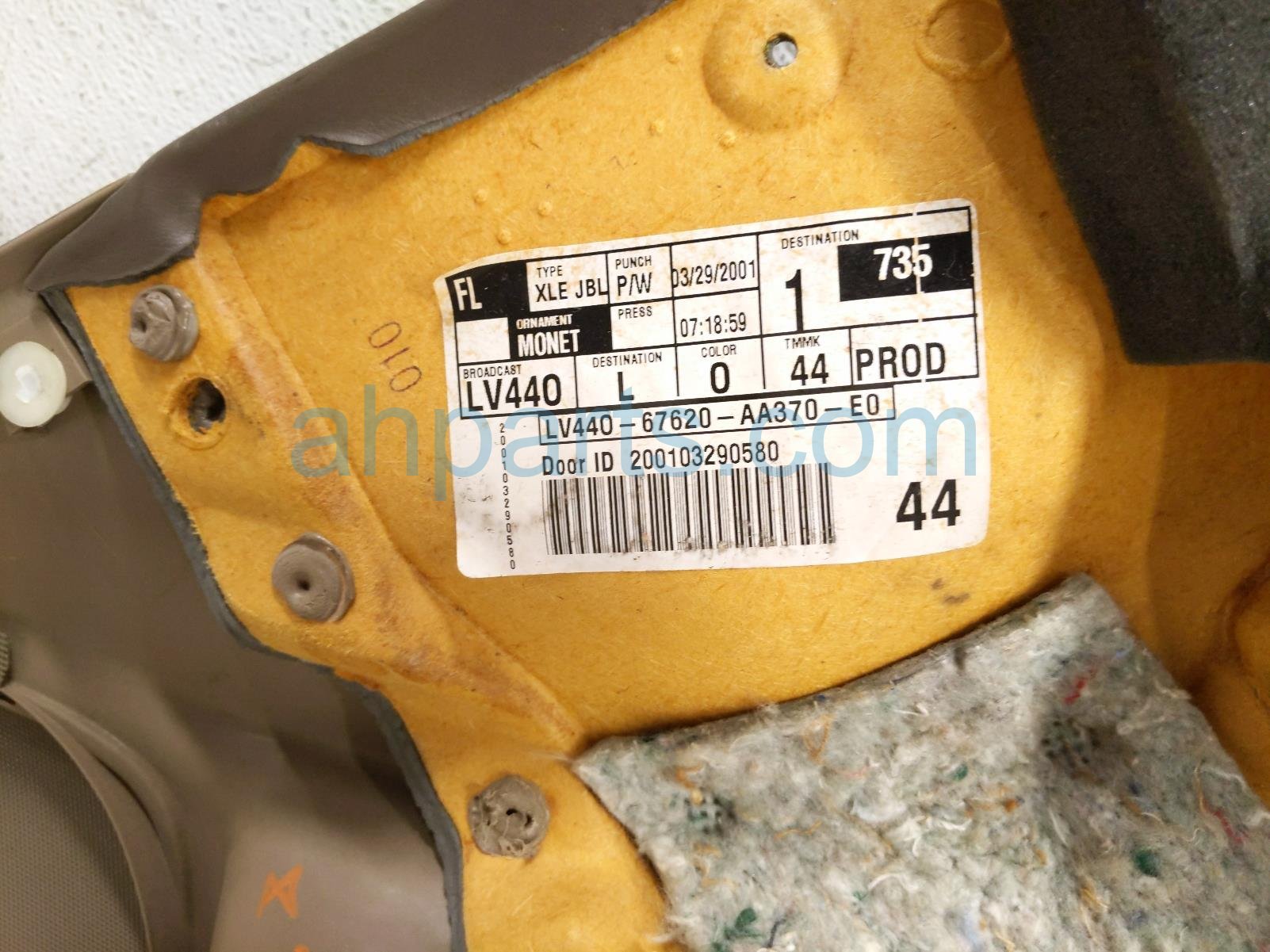 2001 Toyota Camry front trim liner front driver interior door panel - beige* is a used item with a 1 year warranty. This OEM replacement front trim liner front driver interior door panel - beige* is genuine and has part numbers 67620-AA340-B0, and 67620AA340B0. This Toyota part sells for $95. This item has the following note: '*master switch sold seperately* has some scuffs/scratches - grade b.'