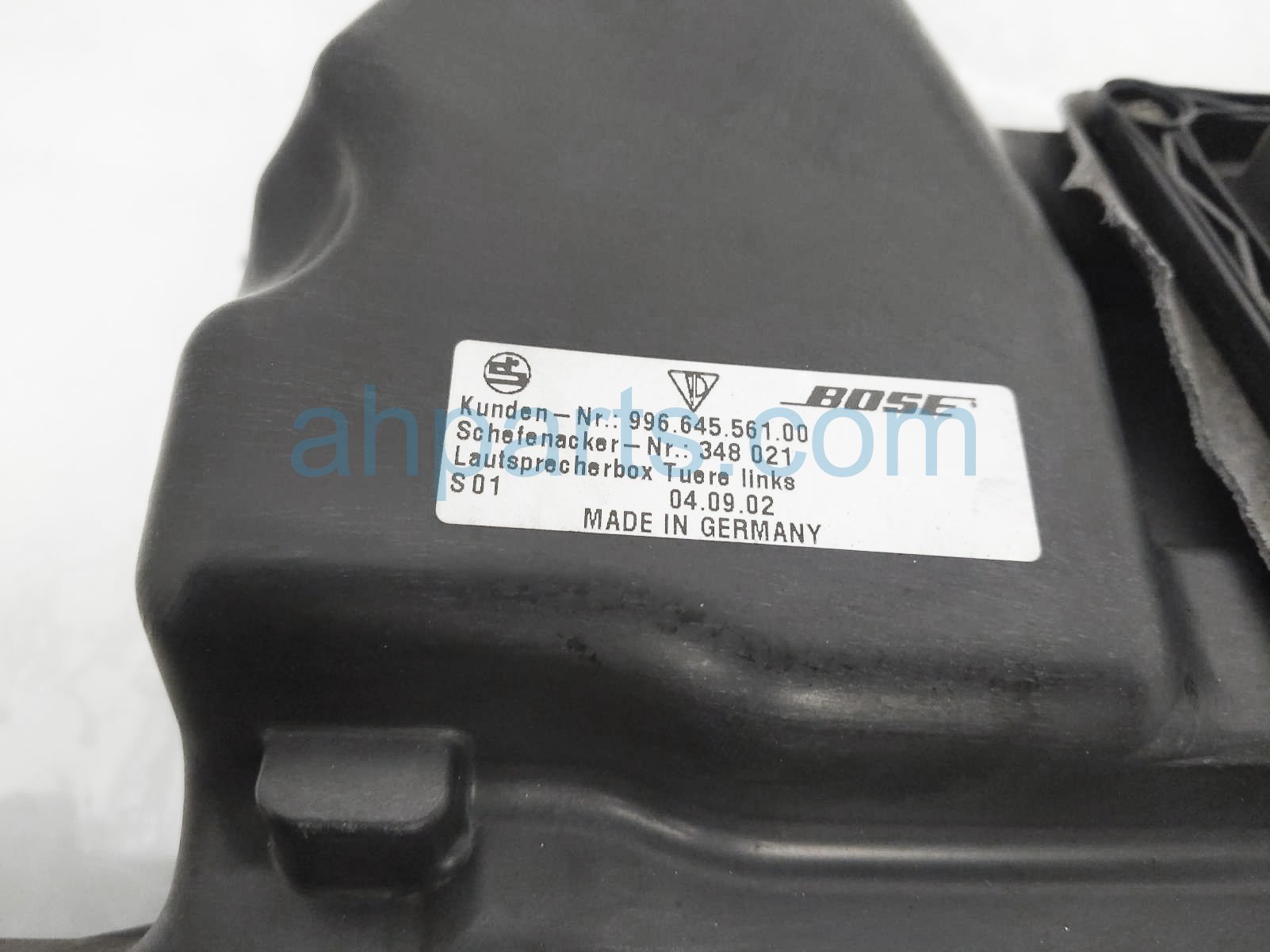 2003 Porsche Boxster driver door speaker assy is a used item with a 1 year warranty. This OEM replacement driver door speaker assy is genuine and has part numbers 996-645-561-00, and 99664556100. This Porsche part sells for $65. This item has the following note: 'Has a ripped area.'