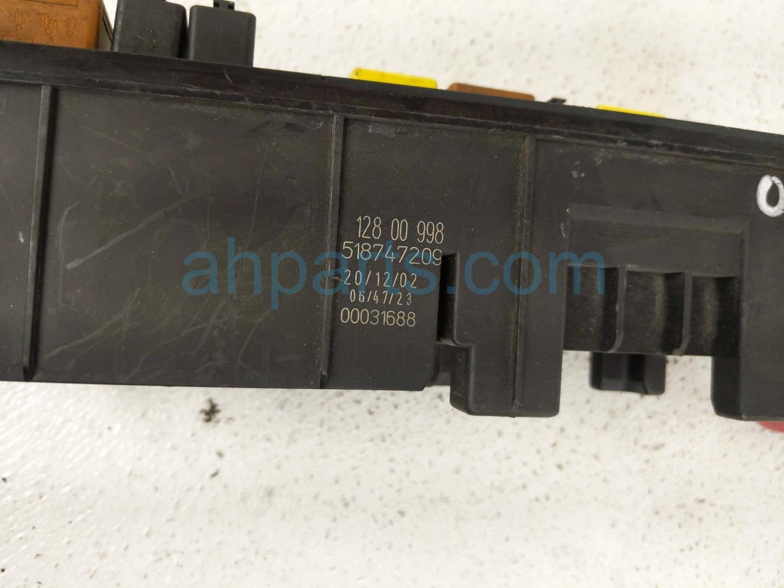 2003 Saab 9-3 box fuse relay junction block is a used item with a 1 year warranty. This OEM replacement box fuse relay junction block is genuine and has part numbers 12757685, 128 00 998, 518747209, and 00031688. This Saab part sells for $99.