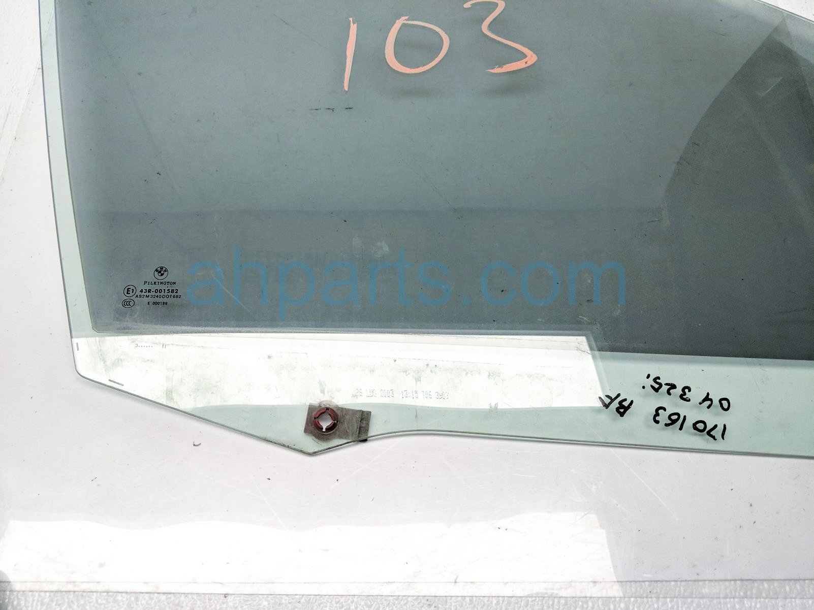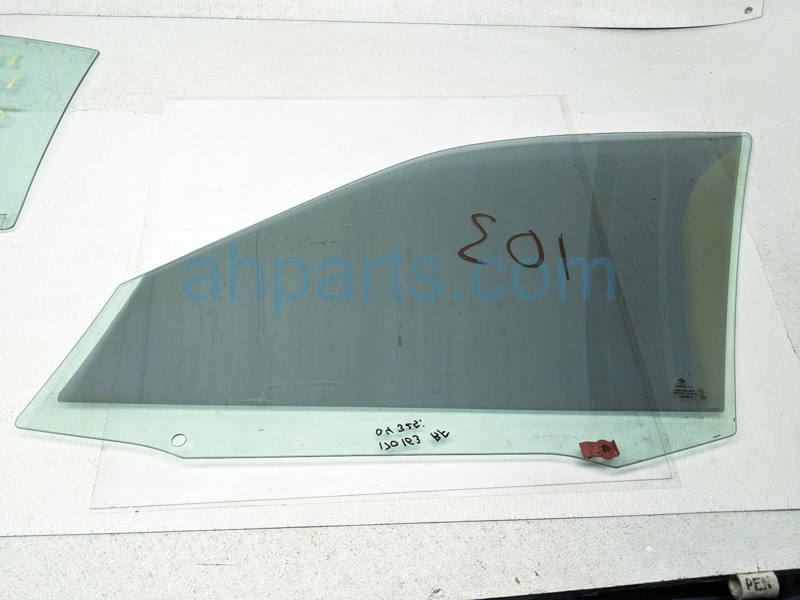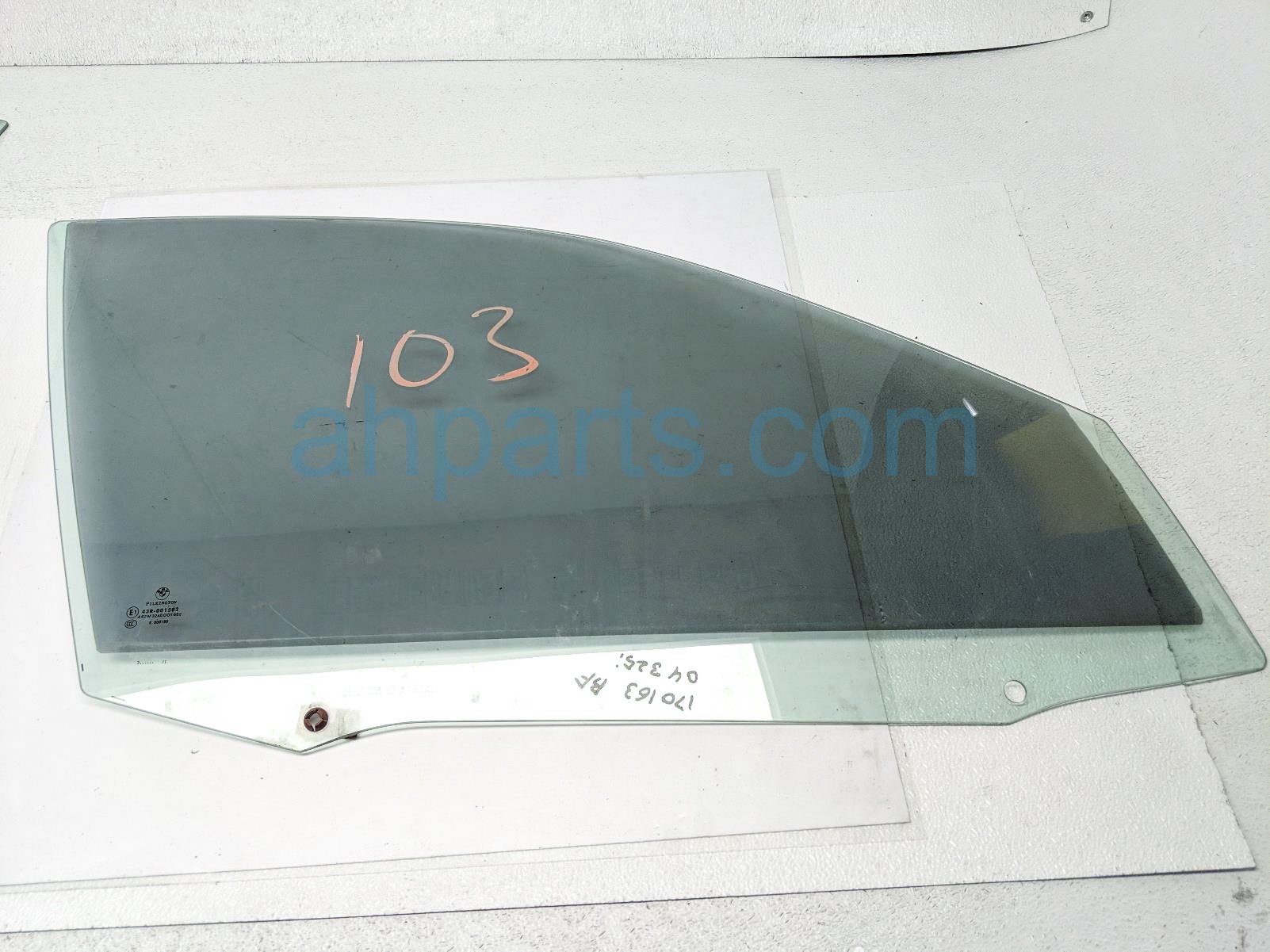 2004 BMW 325I front passenger door glass window - tinted is a used item with a 1 year warranty. This OEM replacement front passenger door glass window - tinted is genuine and has part numbers 51-33-8-196-026, and 51338196026. This BMW part sells for $50.