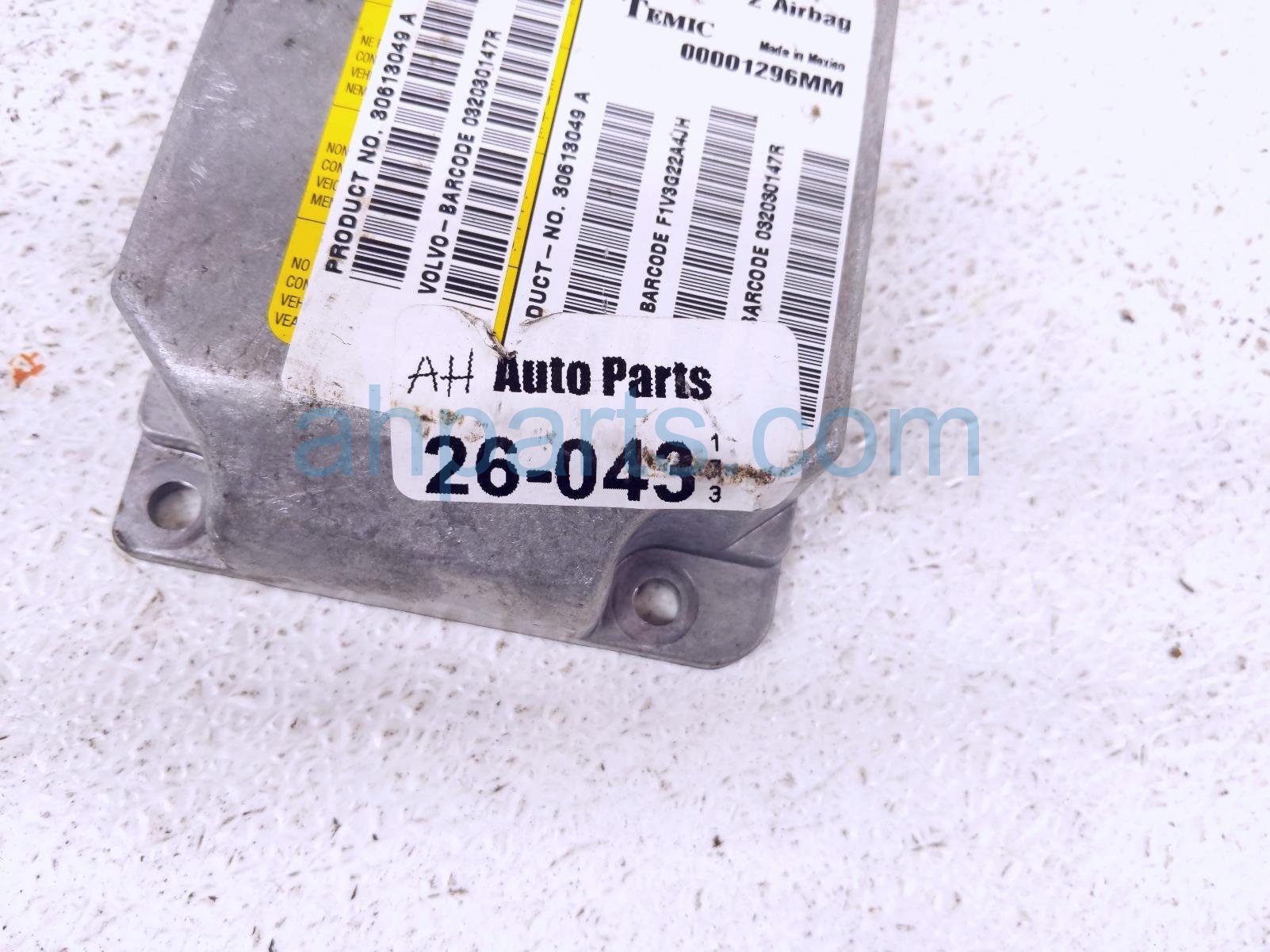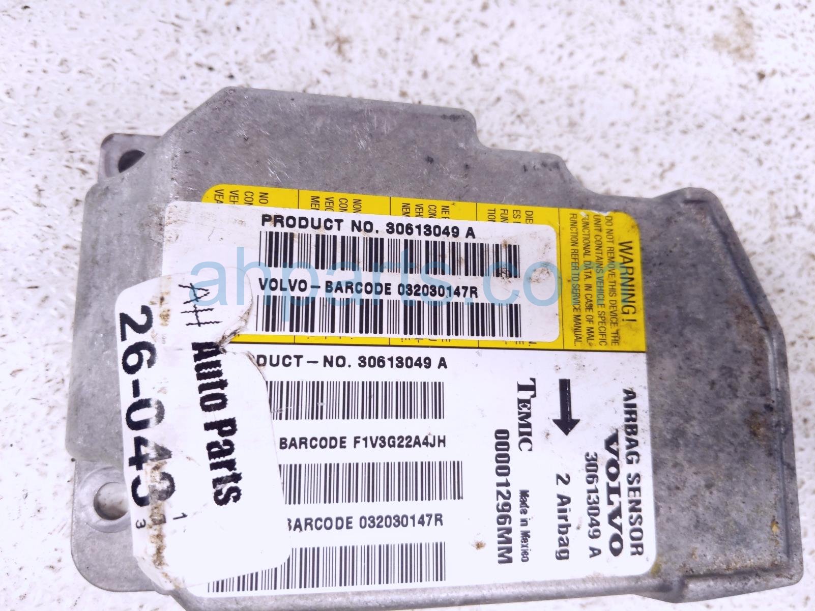 2004 Volvo S40 srs airbag computer -0 blown ab is a used item with a 1 year warranty. This OEM replacement srs airbag computer -0 blown ab is genuine and has part numbers 30613049, 00001296MM, 032030147R, and F1V3G22A4JH. This Volvo part sells for $99.