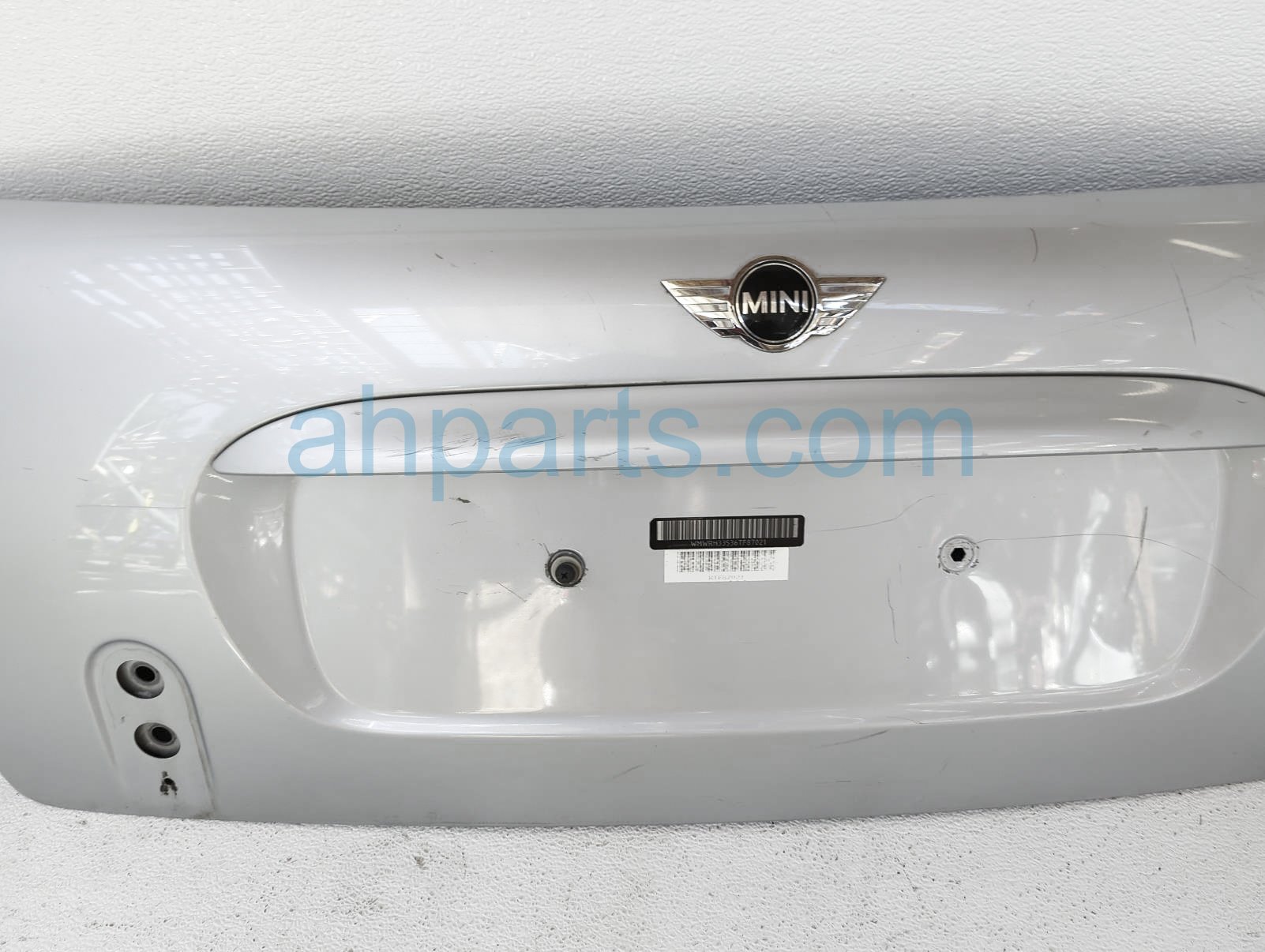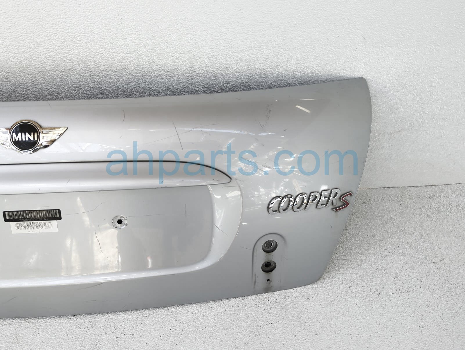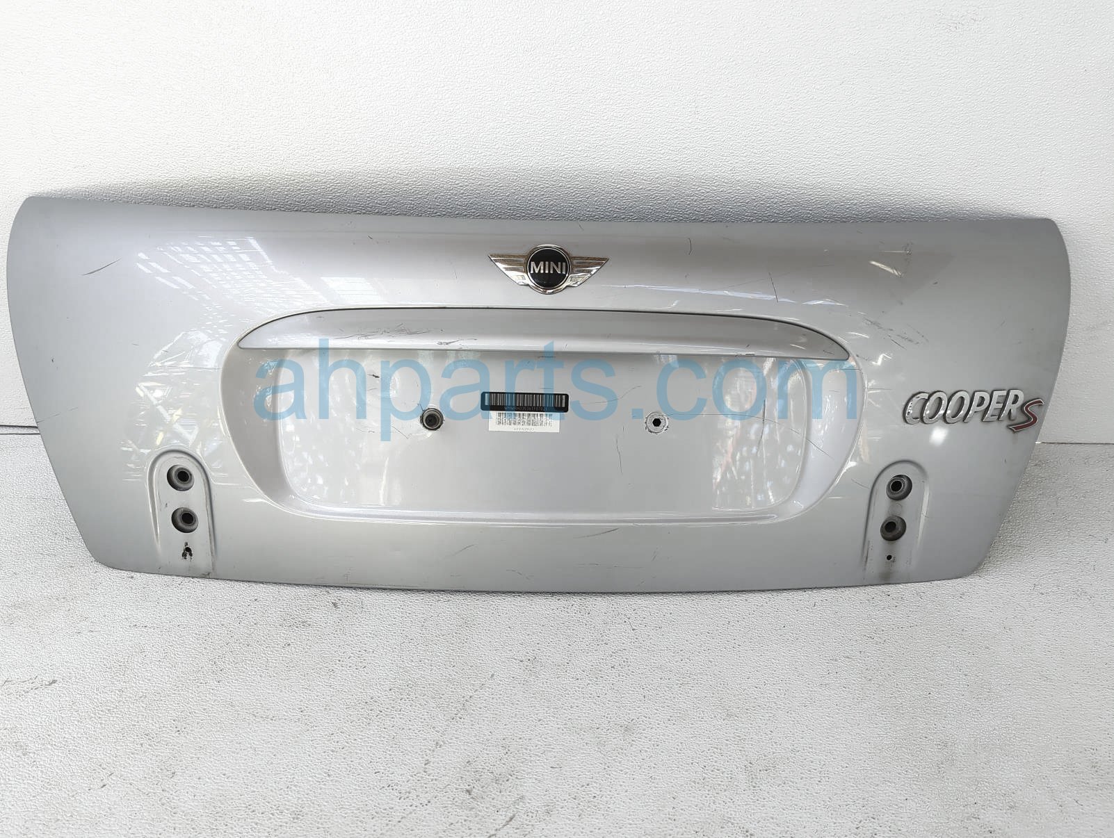 2006 BMW Mini Cooper deck / trunk lid rear tailgate - silver - is a used item with a 1 year warranty. This OEM replacement deck / trunk lid rear tailgate - silver - is genuine and has part numbers 41-62-7-132-880, 41627132880, 51-24-7-197-491, 51247197491, 51-13-7-075-582, and 51137075582. This BMW part sells for $170. This item has the following note: 'This item has alot of deep scratches.'