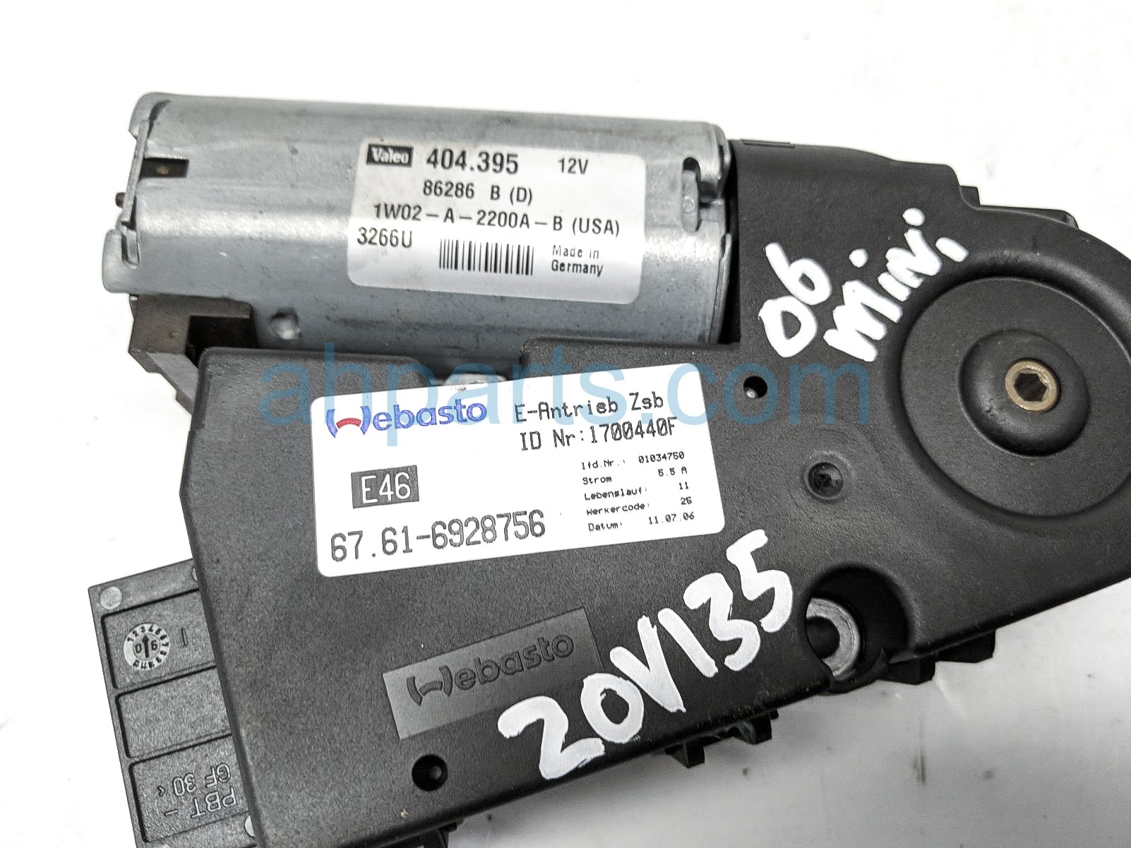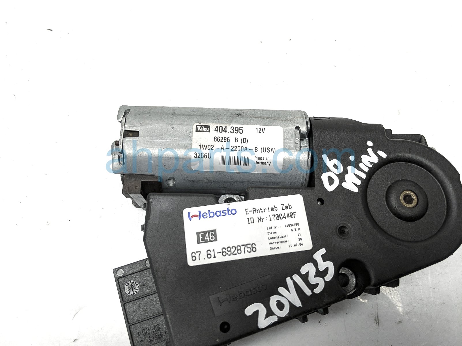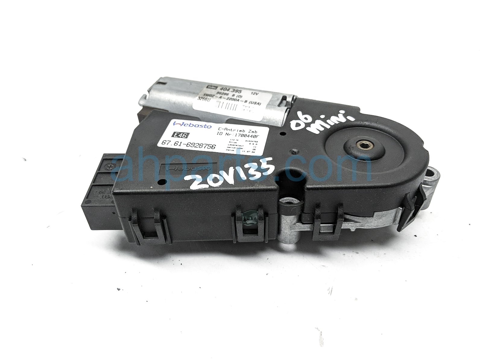 2006 BMW Mini Cooper sunroof motor unit is a used item with a 1 year warranty. This OEM replacement sunroof motor unit is genuine and has part numbers 67-61-6-928-756, and 67616928756. This BMW part sells for $90.