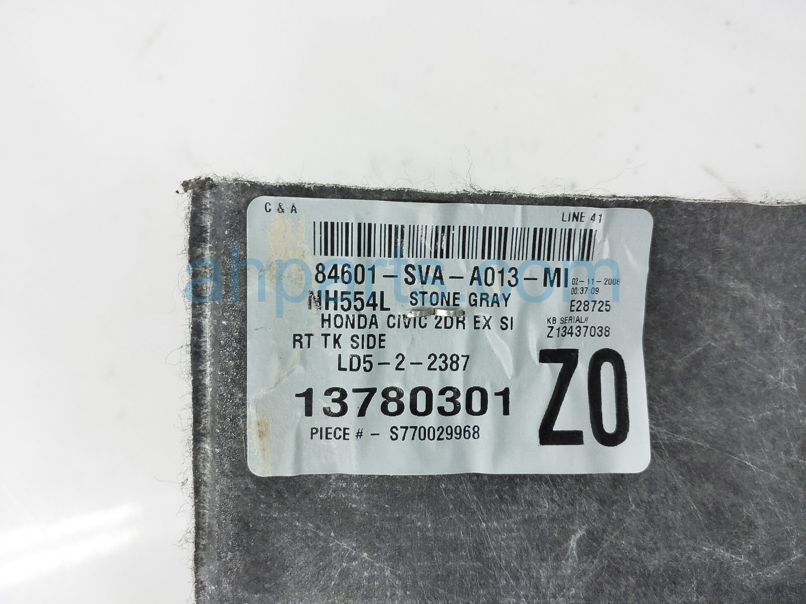 2006 Honda Civic passenger cargo trunk trim liner - black is a used item with a 1 year warranty. This OEM replacement passenger cargo trunk trim liner - black is genuine and has part numbers 84601-SVA-A03ZA, and 84601SVAA03ZA. This Honda part sells for $19.