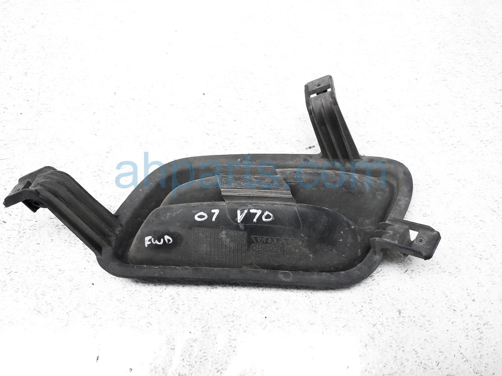 2007 Volvo V70 front passenger bumper molding cap is a used item with a 1 year warranty. This OEM replacement front passenger bumper molding cap is genuine and has part numbers 08693352. This Volvo part sells for $10.