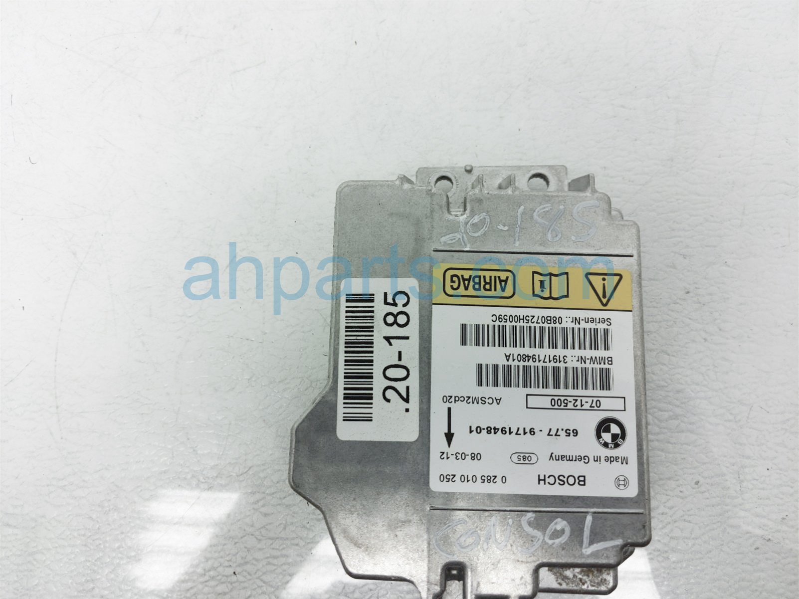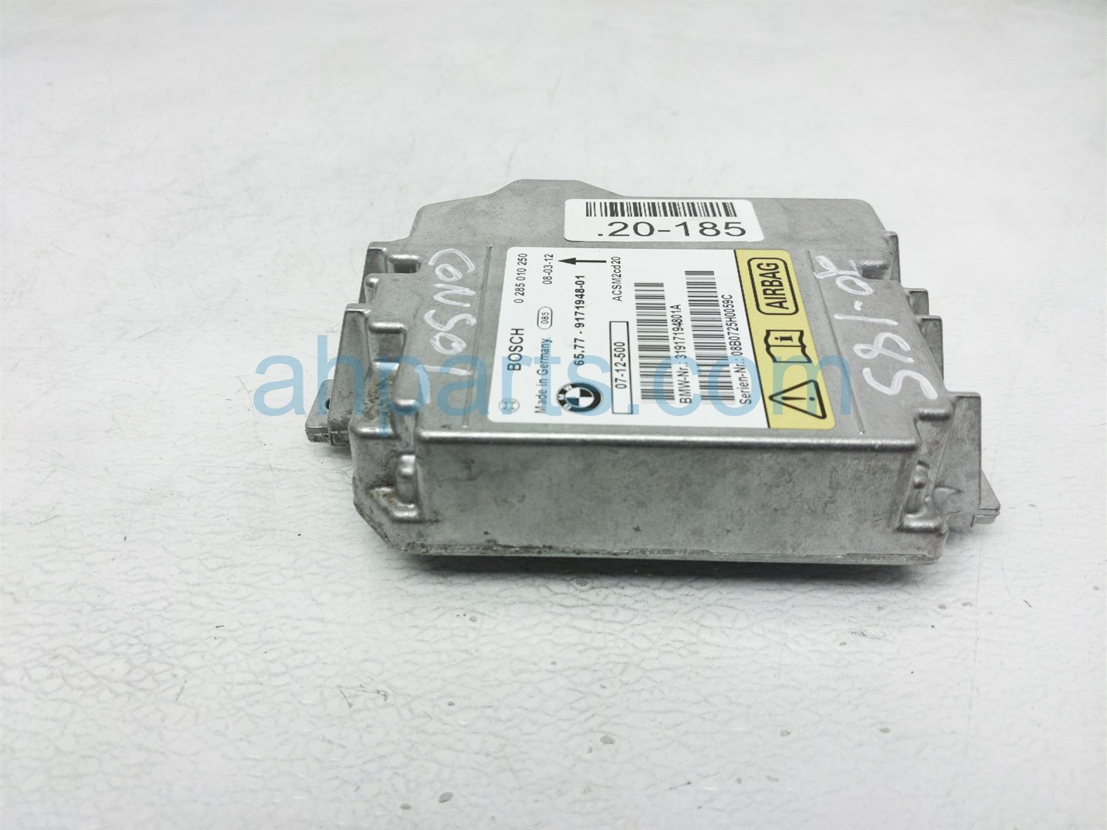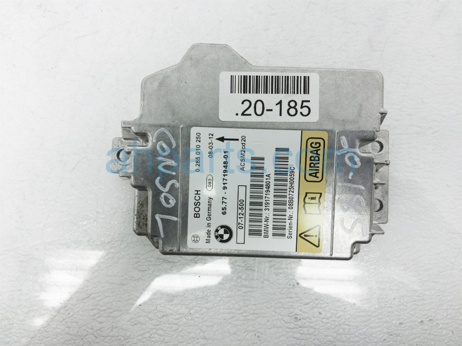 2008 BMW X5 srs airbag computer module is a used item with a 1 year warranty. This OEM replacement srs airbag computer module is genuine and has part numbers 65-77-9-240-083, 65779240083, 65-77-9-171-948, and 65779171948. This BMW part sells for $85.