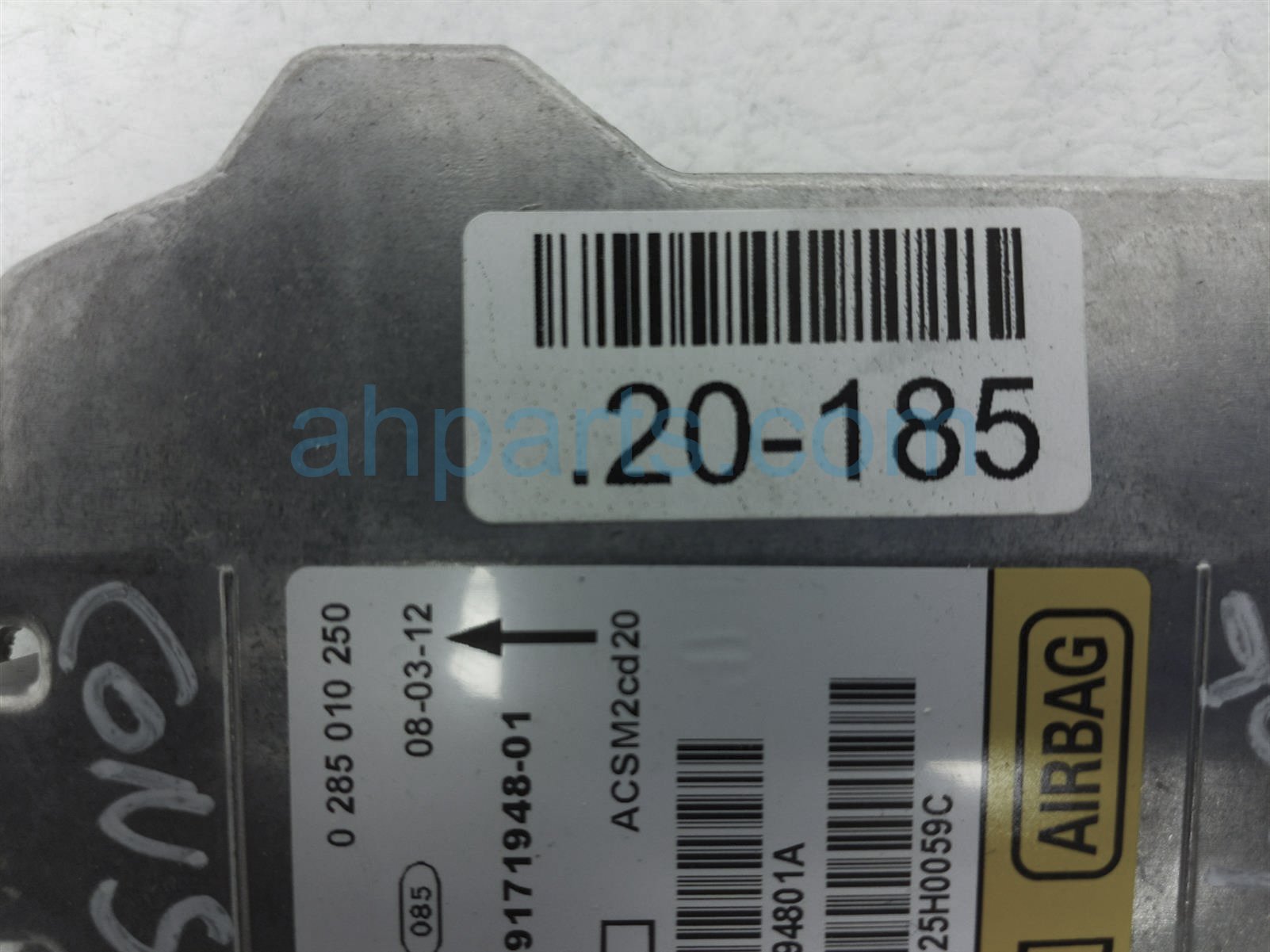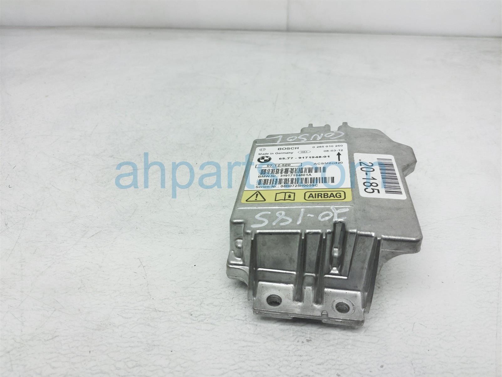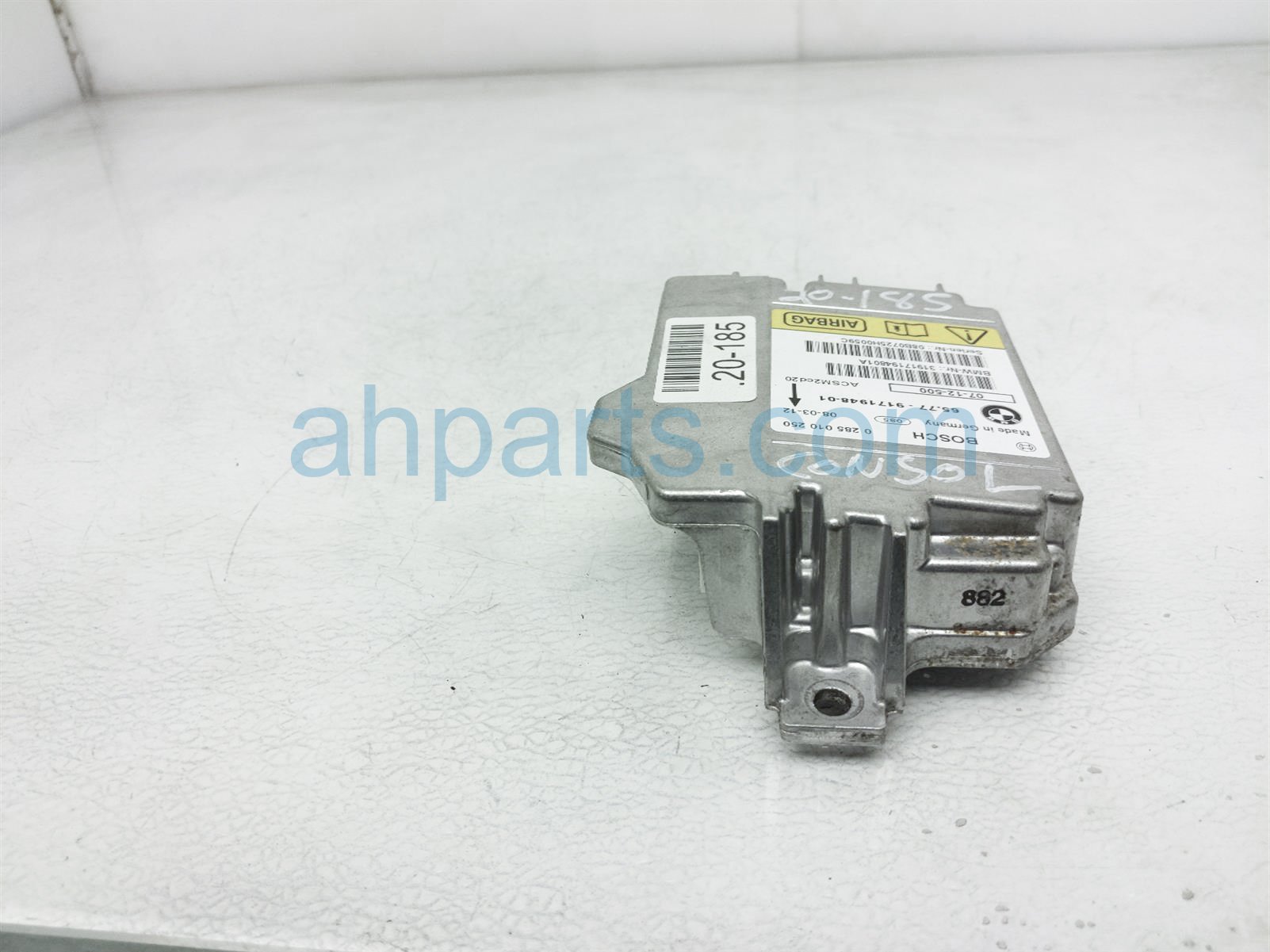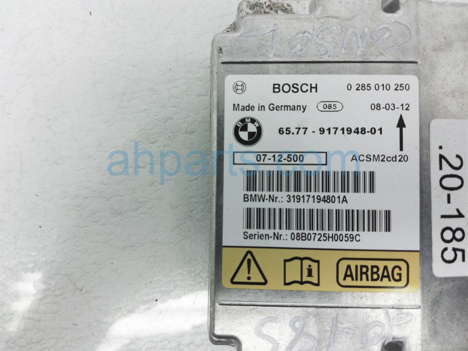 2008 BMW X5 srs airbag computer module is a used item with a 1 year warranty. This OEM replacement srs airbag computer module is genuine and has part numbers 65-77-9-240-083, 65779240083, 65-77-9-171-948, and 65779171948. This BMW part sells for $85.