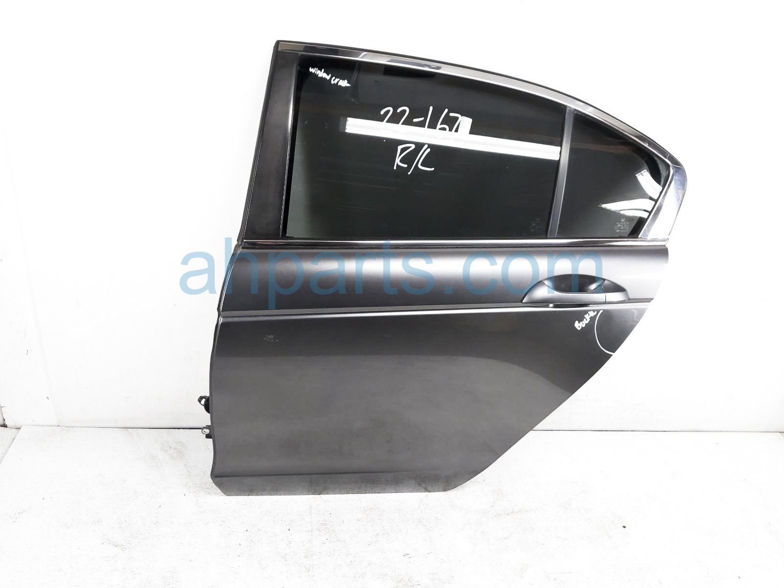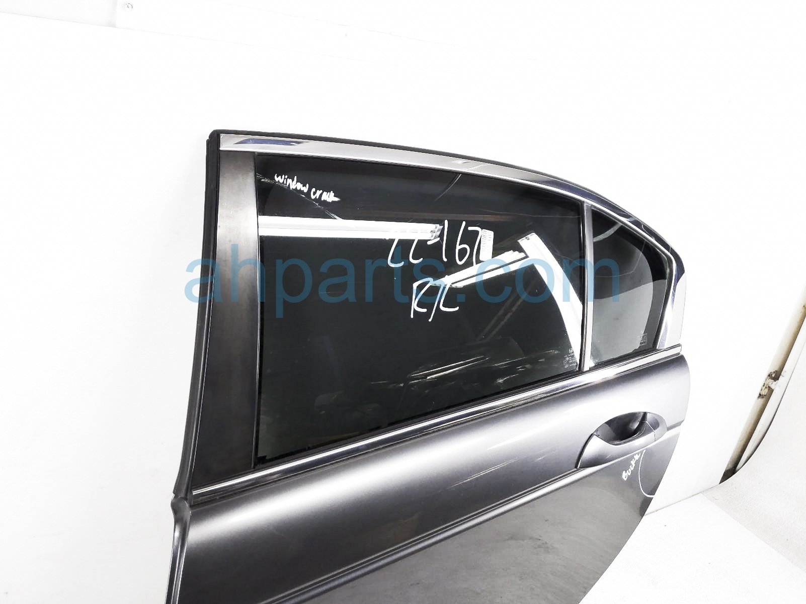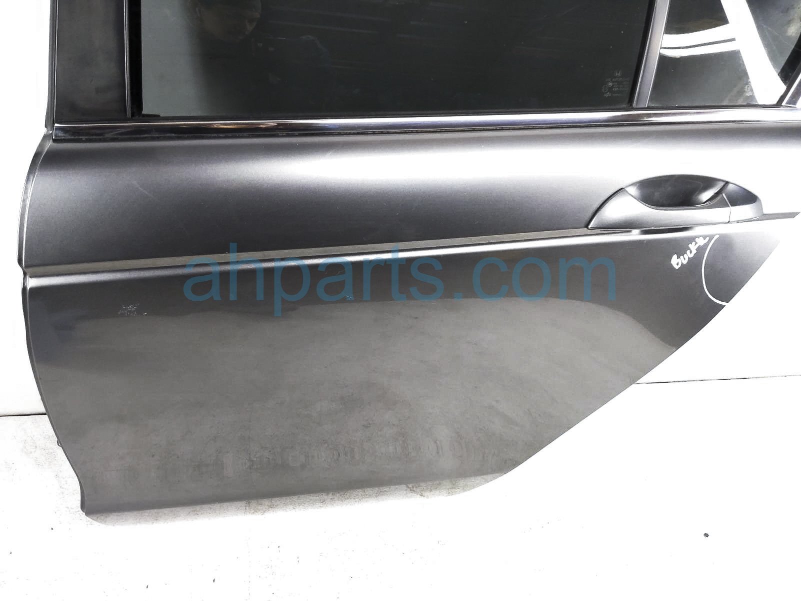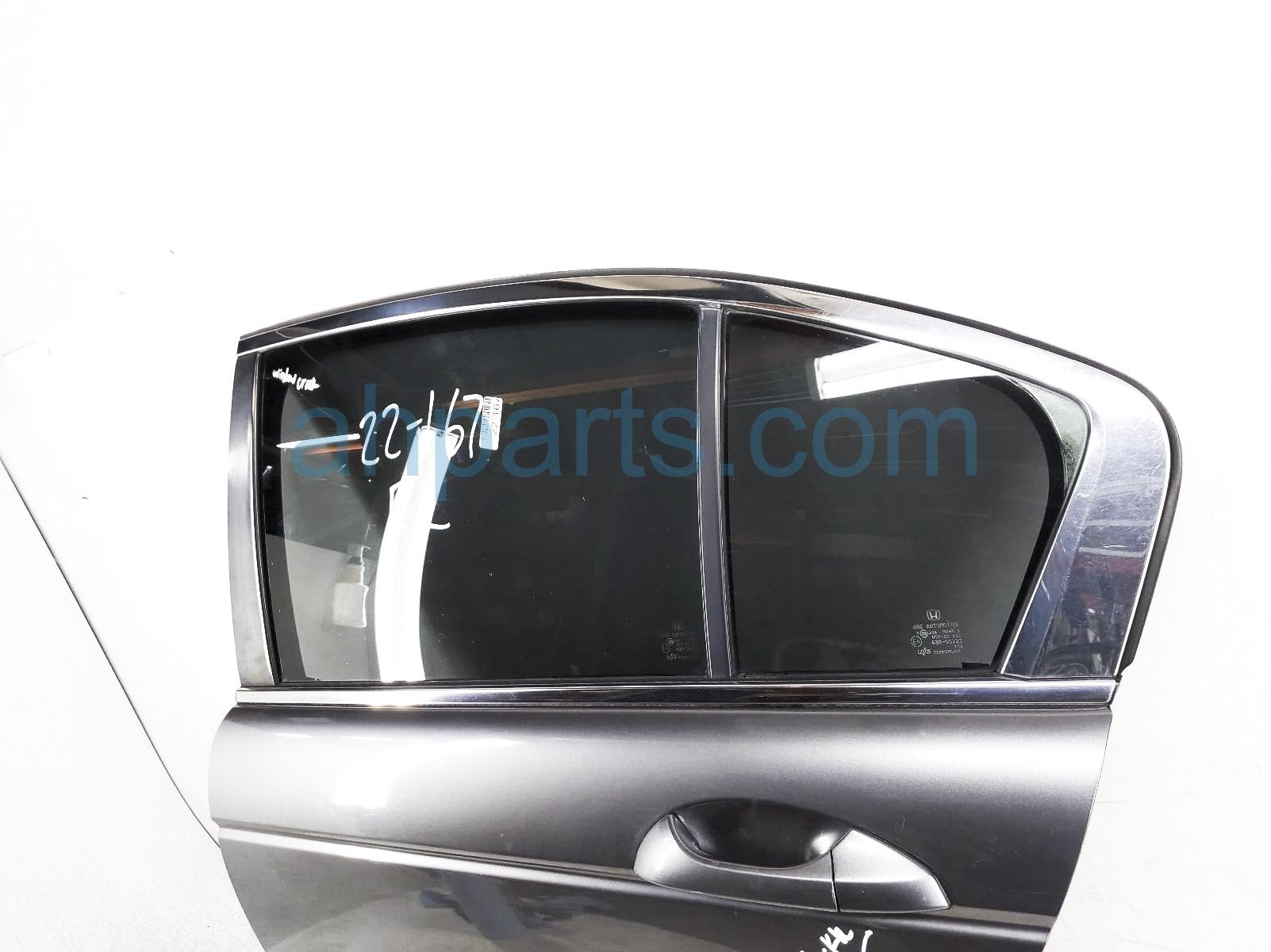 2008 Honda Accord rear driver door - grey - no inside trim is a used item with a 1 year warranty. This OEM replacement rear driver door - grey - no inside trim is genuine and has part numbers 67550-TA0-A90ZZ, and 67550TA0A90ZZ. This Honda part sells for $250. This item has the following note: 'Small scuff, door glass cracked & buckled next to door handle.'