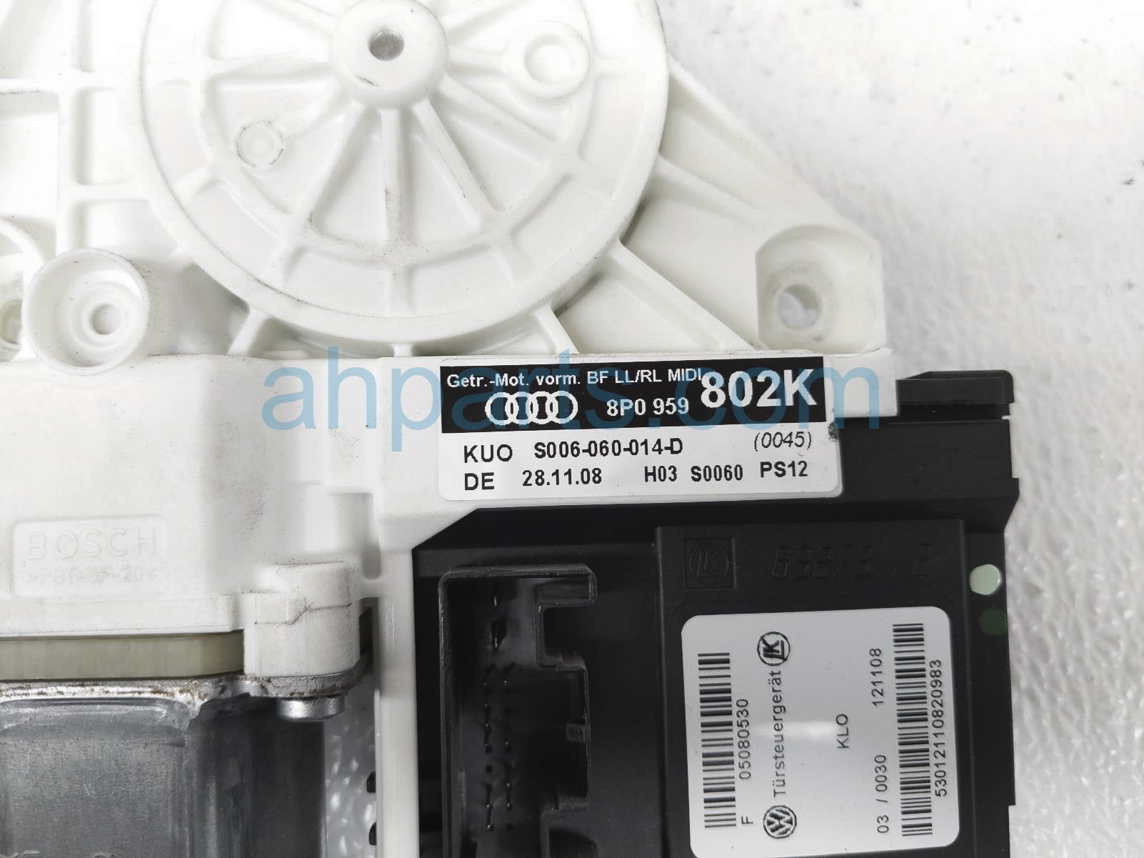 2009 Audi A3 Audi front passenger window motor is a used item with a 1 year warranty. This OEM replacement front passenger window motor is genuine and has part numbers 8P0-959-802-M, and 8P0959802M. This Audi part sells for $50.
