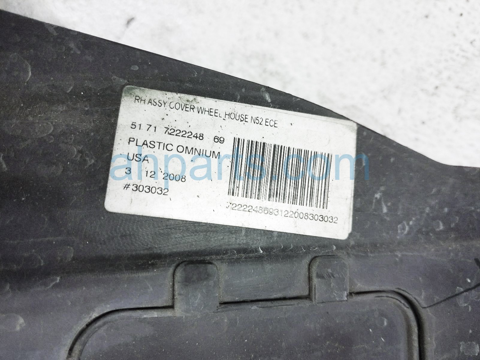 2009 BMW X5 front passenger inner fender liner is a used item with a 1 year warranty. This OEM replacement front passenger inner fender liner is genuine and has part numbers 51-71-7-169-412, and 51717169412. This BMW part sells for $30.