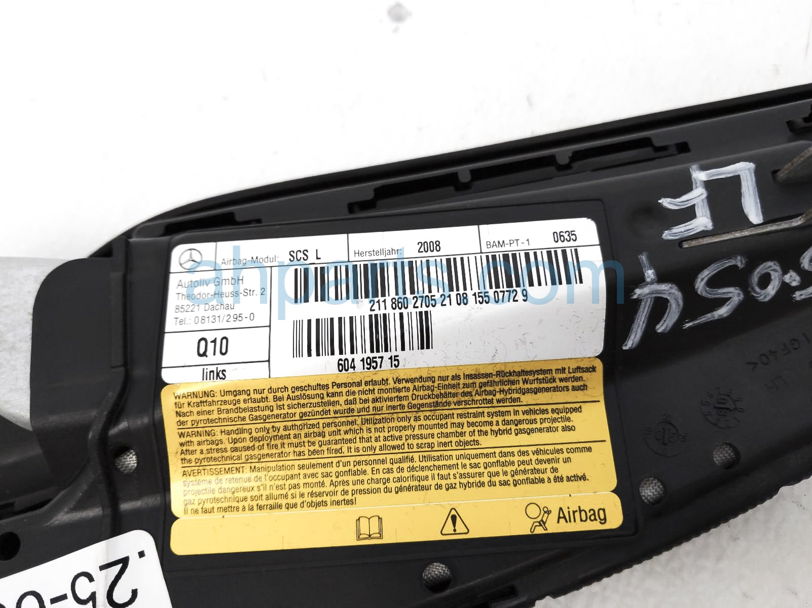 2009 Mercedes E320 driver seat airbag is a used item with a 1 year warranty. This OEM replacement driver seat airbag is genuine and has part numbers 211-860-27-05, and 2118602705. This Mercedes part sells for $125.