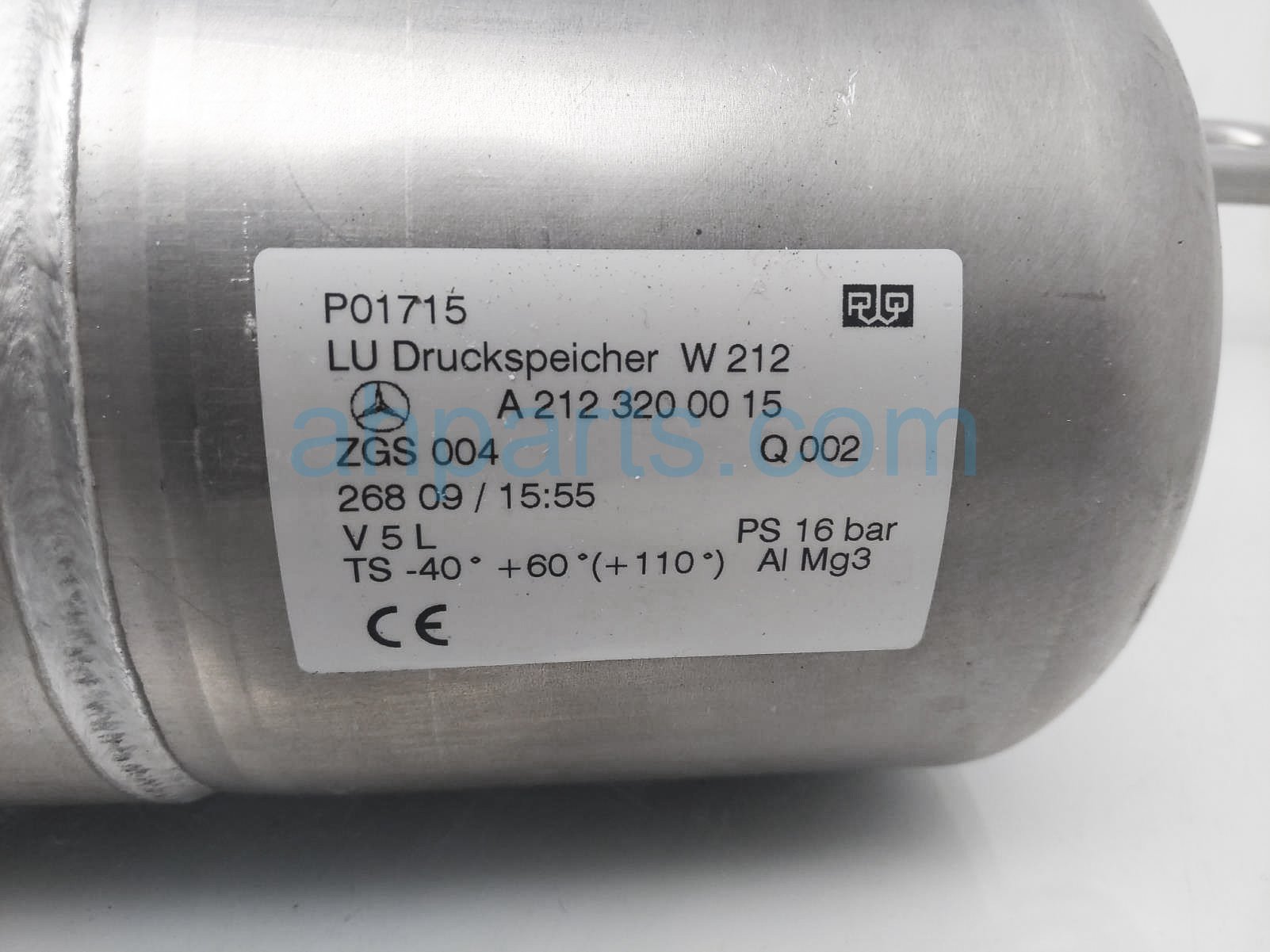 2010 Mercedes E550 air lift suspension accumulator is a used item with a 1 year warranty. This OEM replacement air lift suspension accumulator is genuine and has part numbers 212-320-01-15, 2123200115, 212-320-00-15, and 2123200015. This Mercedes part sells for $100.