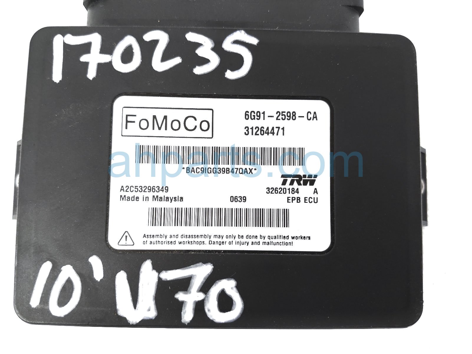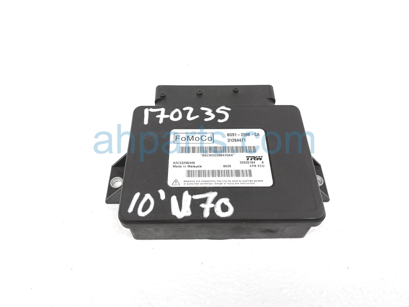 2010 Volvo V70 parking brake control module unit is a used item with a 1 year warranty. This OEM replacement parking brake control module unit is genuine and has part numbers 31445647. This Volvo part sells for $75.