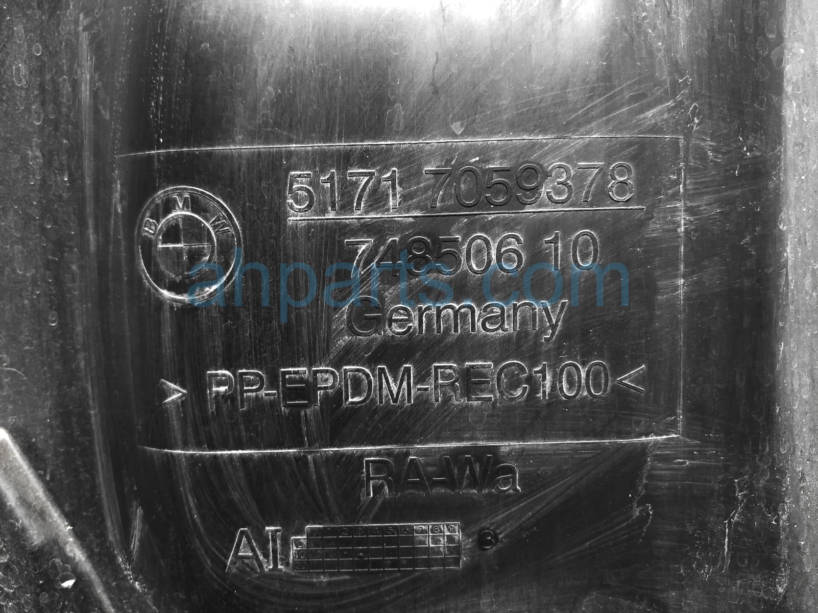 2011 BMW 328I front passenger rearward inner fender liner is a used item with a 1 year warranty. This OEM replacement front passenger rearward inner fender liner is genuine and has part numbers 51-71-7-059-378, and 51717059378. This BMW part sells for $30.