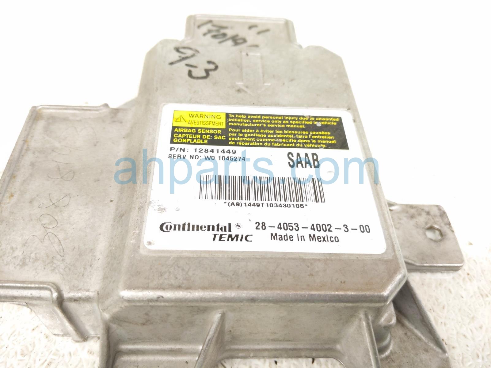 2011 Saab 9-3 airbag control module is a used item with a 1 year warranty. This OEM replacement airbag control module is genuine and has part numbers 12841449. This Saab part sells for $99.