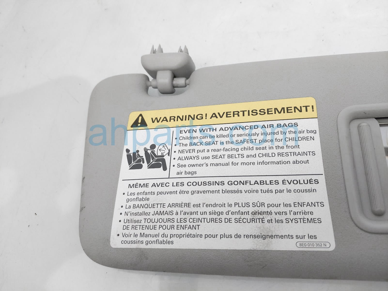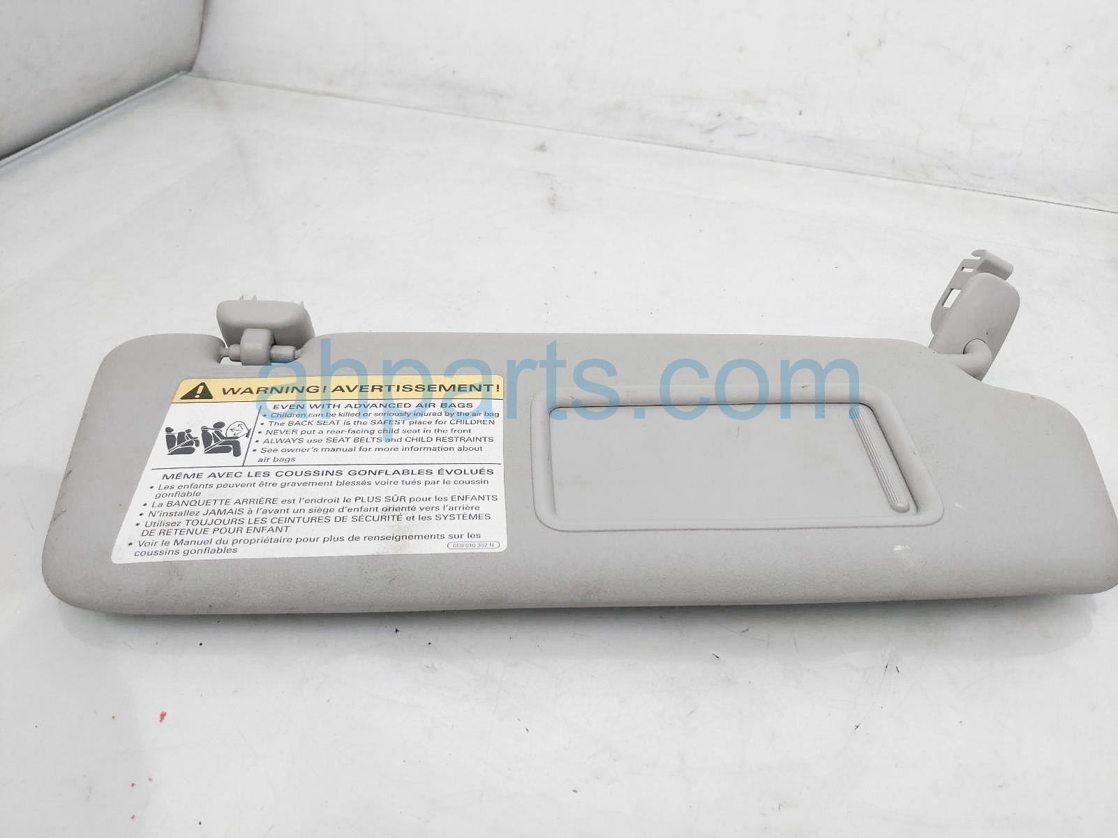 2012 Audi A3 Audi passenger sun visor - gray is a used item with a 1 year warranty. This OEM replacement passenger sun visor - gray is genuine and has part numbers 8P0857552AF9V4. This Audi part sells for $35. This item has the following note: 'A little dirty.'