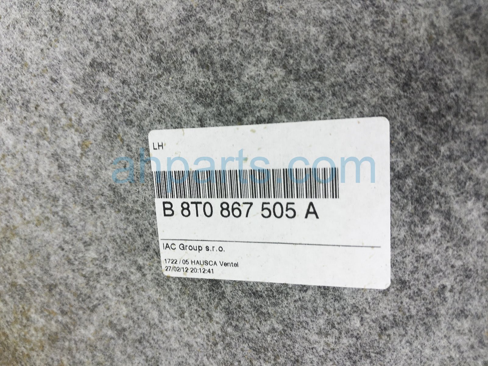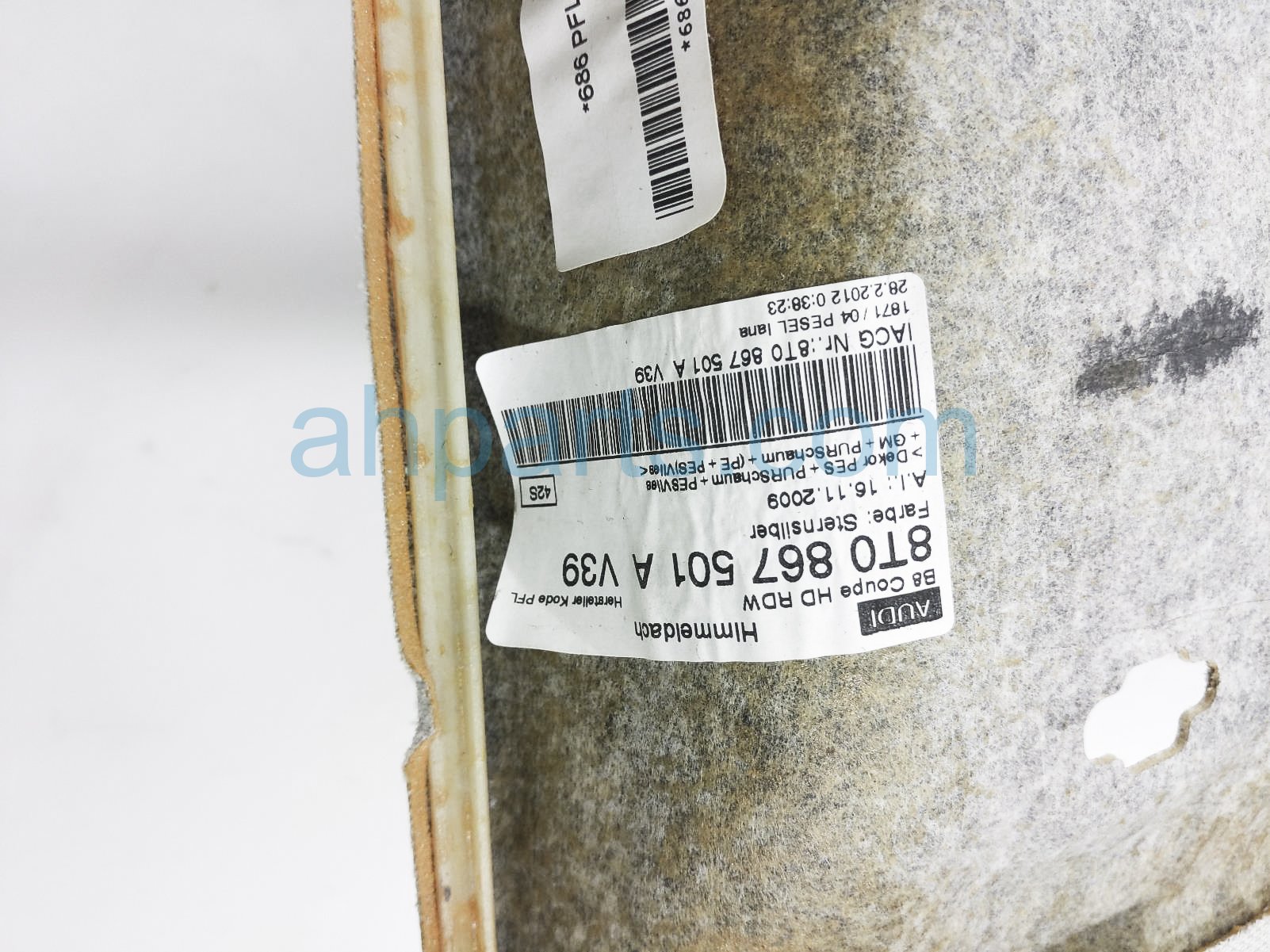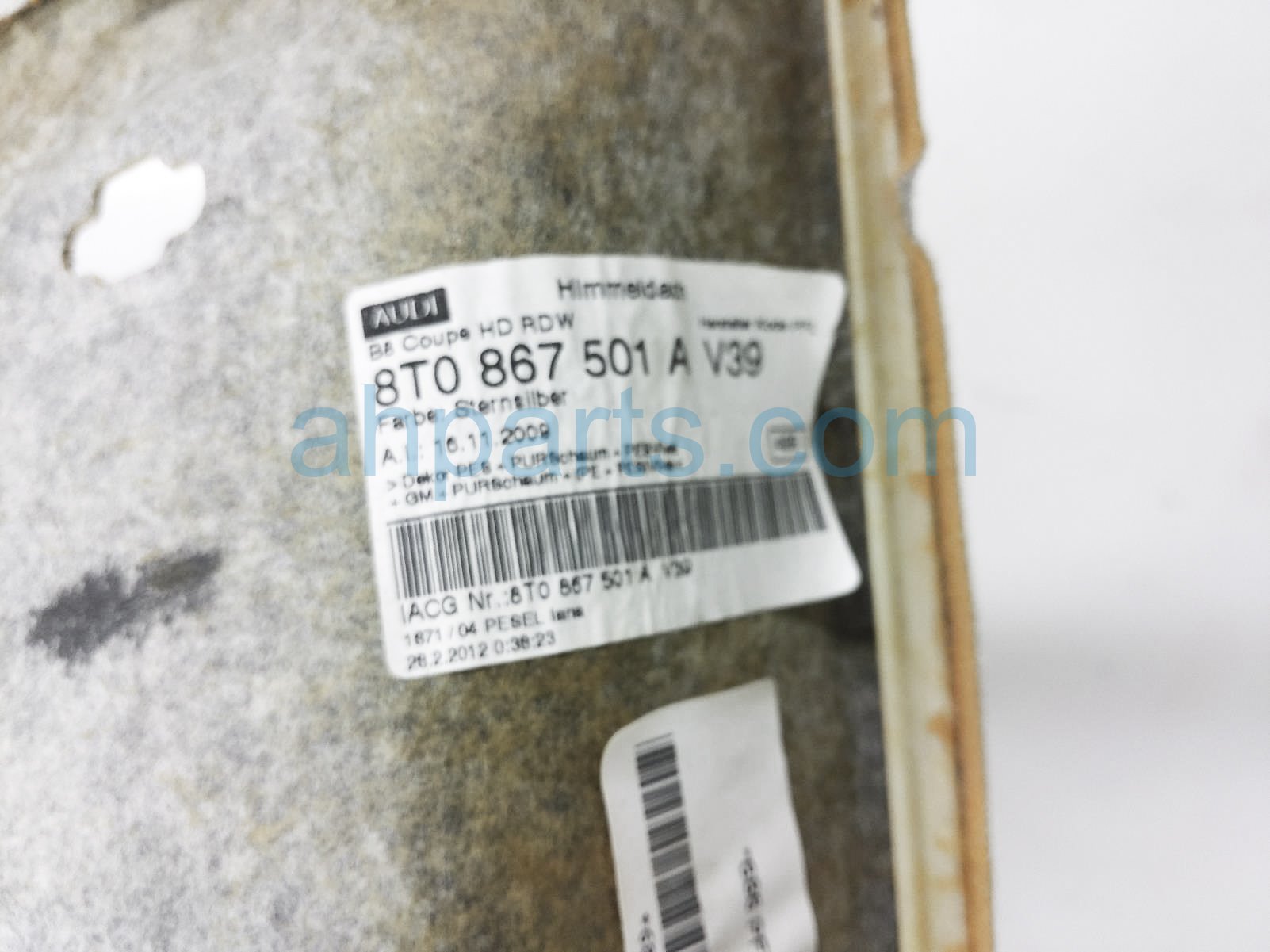 2012 Audi A5 Audi headliner w/ sunroof - grey is a used item with a 1 year warranty. This OEM replacement headliner w/ sunroof - grey is genuine and has part numbers 8T0 867 501 A V39, and 8T0867501Av39. This Audi part sells for $140. This item has the following note: 'Dirty.'
