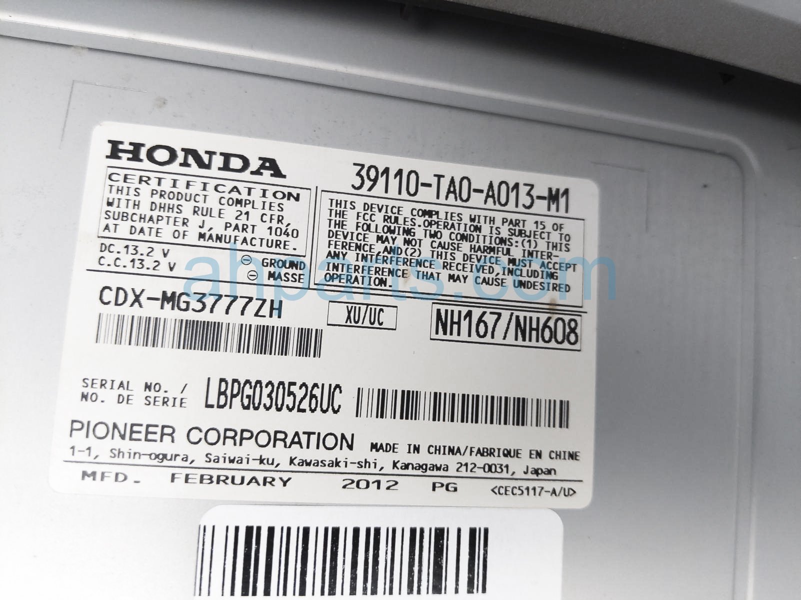 2012 Honda Accord 6 disc cd player assy is a used item with a 1 year warranty. This OEM replacement 6 disc cd player assy is genuine and has part numbers 39110-TA0-A01ZB, and 39110TA0A01ZB. This Honda part sells for $40.