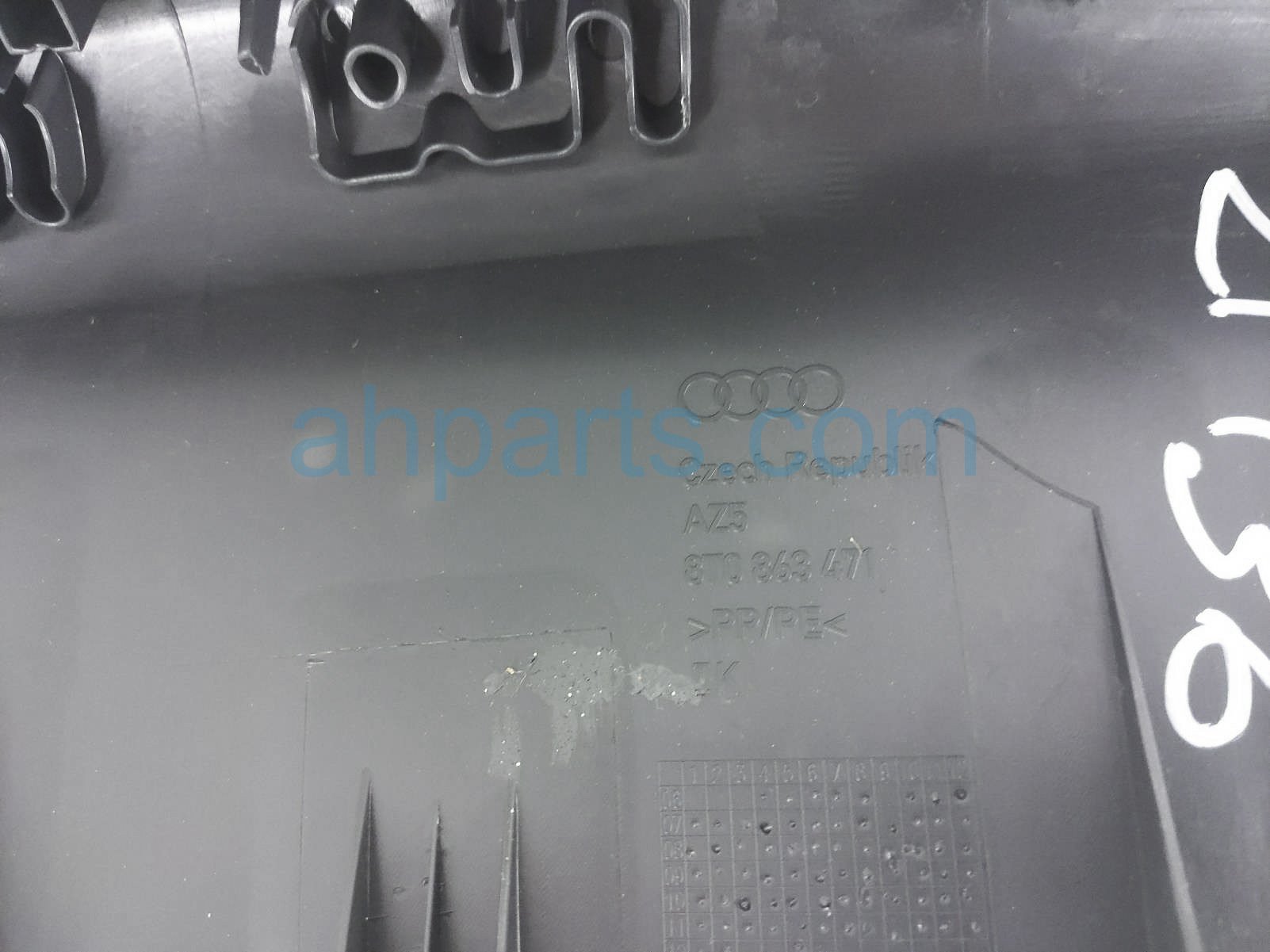 2013 Audi A5 Audi rear trunk scuff plate trim panel is a used item with a 1 year warranty. This OEM replacement rear trunk scuff plate trim panel is genuine and has part numbers 8T0-863-471-A-4PK, and 8T0863471A4PK. This Audi part sells for $20.