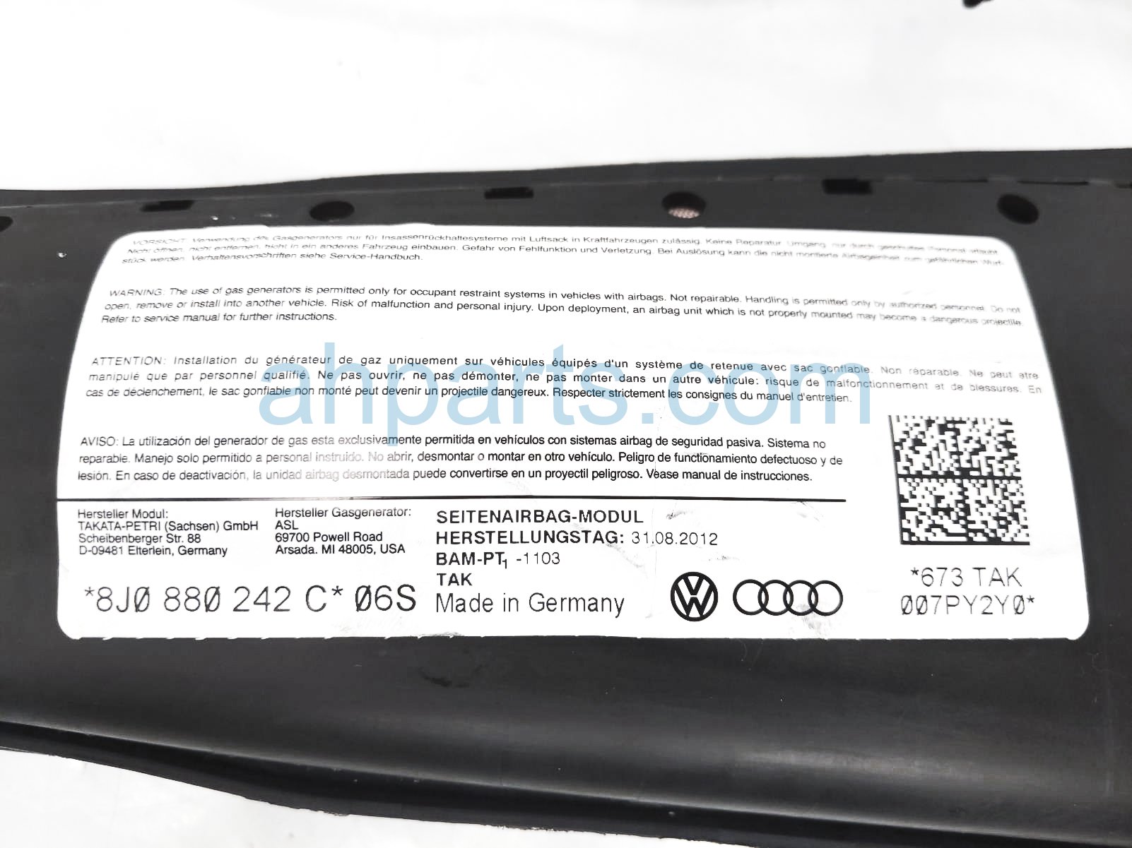 2013 Audi TT Audi airbag passenger side seat air bag is a used item with a 1 year warranty. This OEM replacement airbag passenger side seat air bag is genuine and has part numbers 305458410, 8J0-880-242-C, and 8J0880242C. This Audi part sells for $200.