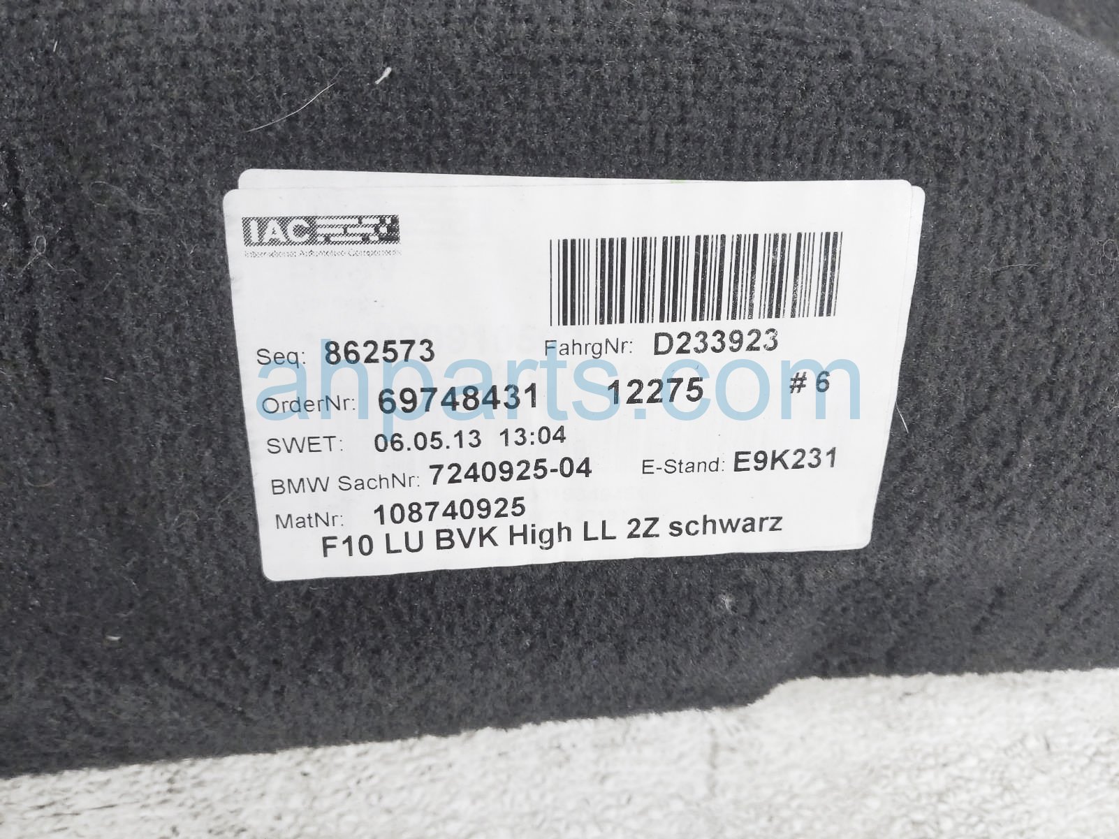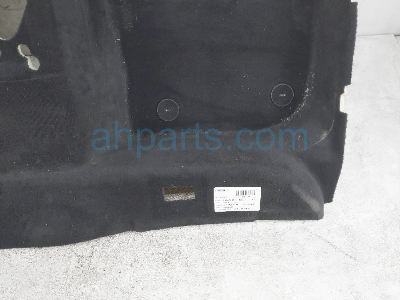 2013 BMW 528I ground rear floor carpet assy - black is a used item with a 1 year warranty. This OEM replacement ground rear floor carpet assy - black is genuine and has part numbers 51477224533. This BMW part sells for $90.