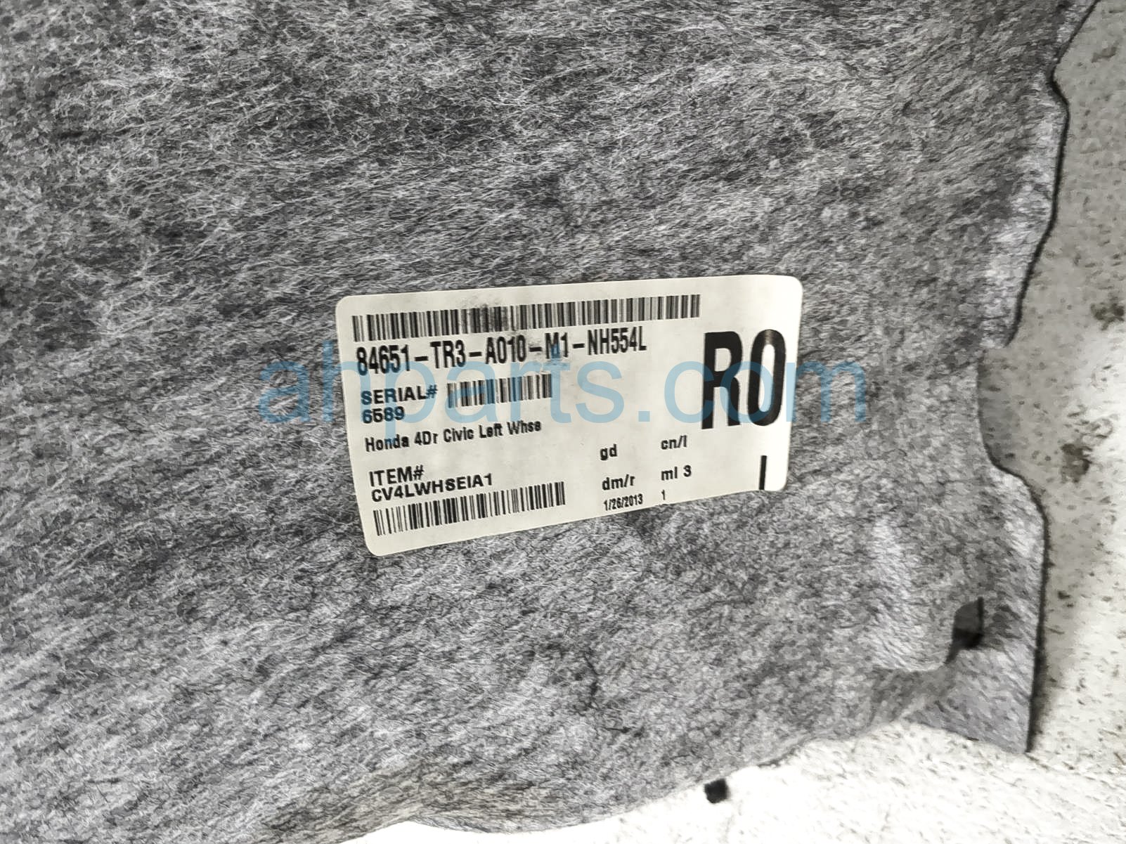 2013 Honda Civic driver cargo room trim liner - blk * is a used item with a 1 year warranty. This OEM replacement driver cargo room trim liner - blk * is genuine and has part numbers 84651-TR3-A01ZA, and 84651TR3A01ZA. This Honda part sells for $49. This item has the following note: 'This item has a minor ripped tab and some mold area - grade b.'