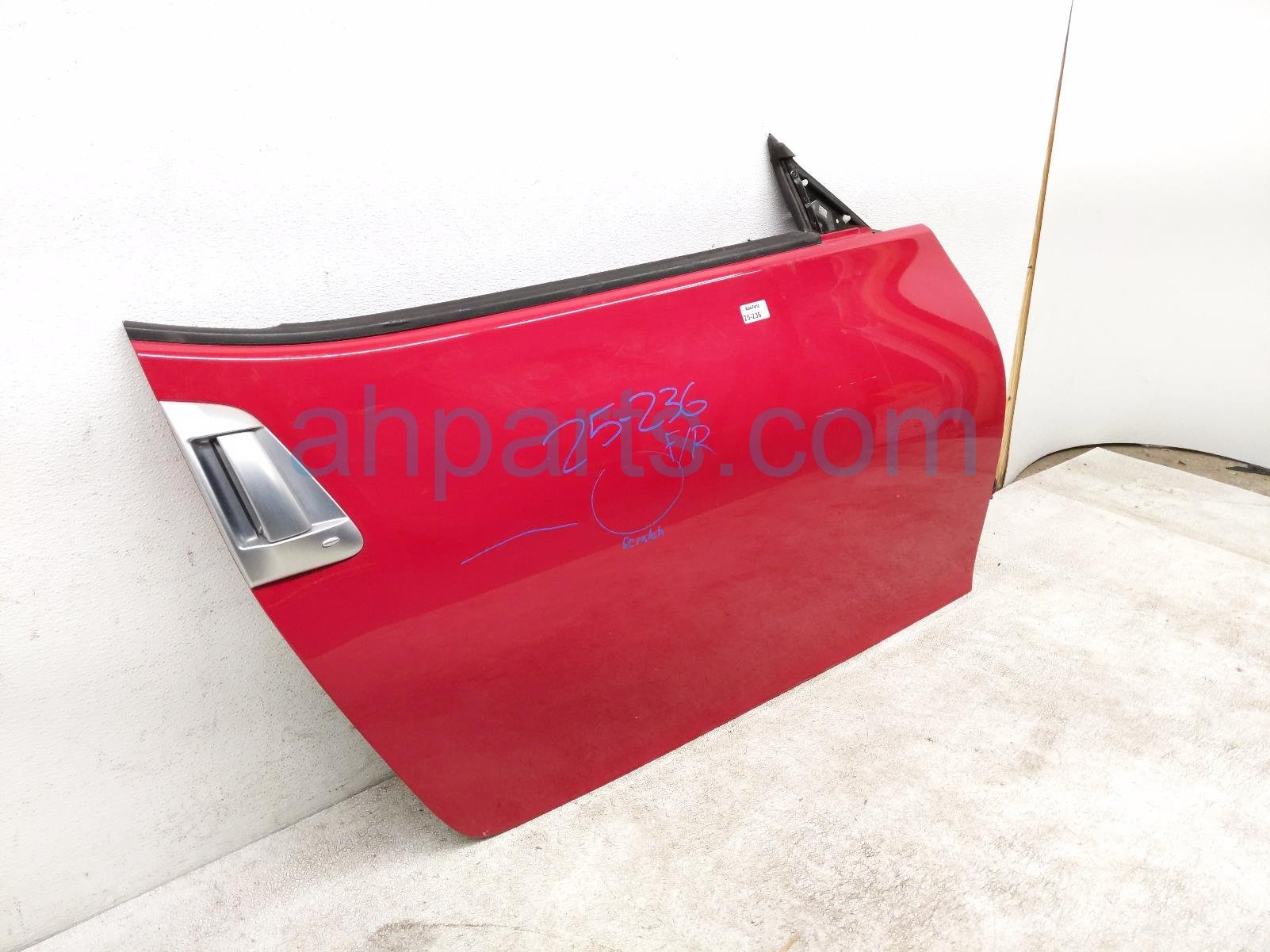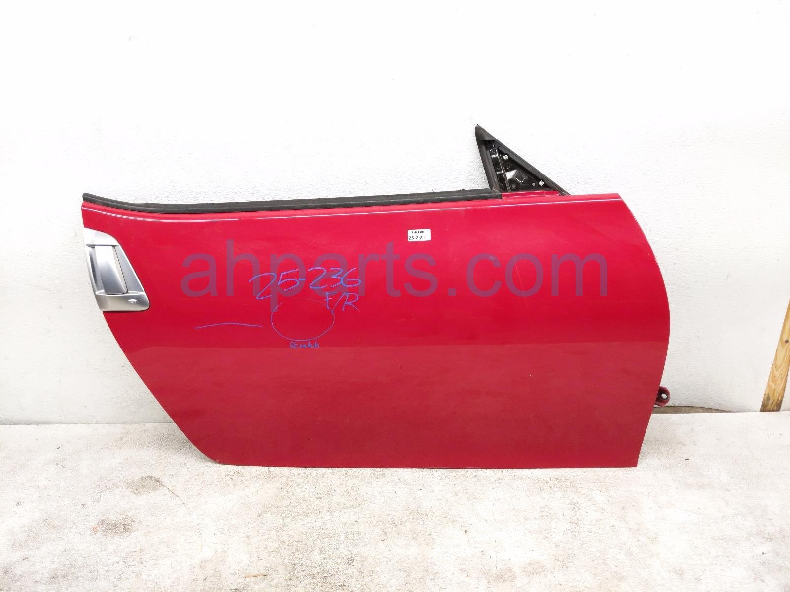2013 Nissan 370Z front passenger door - red - no mirror/trim * is a used item with a 1 year warranty. This OEM replacement front passenger door - red - no mirror/trim * is genuine and has part numbers HMA0M-1EAMA, HMA0M1EAMA, 24124-3GY0B, and 241243GY0B. This Nissan part sells for $499. This item has the following note: 'This item has some scratches and chips on the paint.'