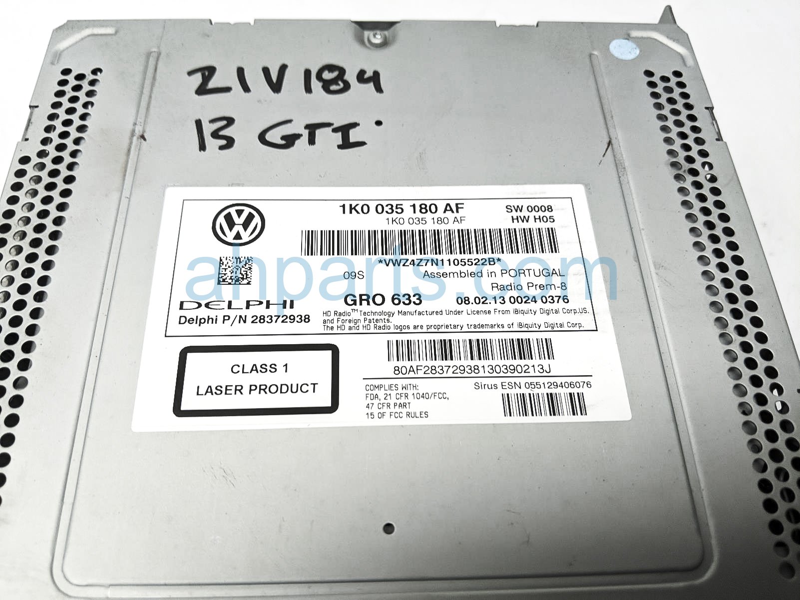 2013 Volkswagen Golf GTI audio radio unit w/ screen is a used item with a 1 year warranty. This OEM replacement audio radio unit w/ screen is genuine and has part numbers 1K0-035-180-AF, and 1K0035180AF. This Volkswagen part sells for $75.