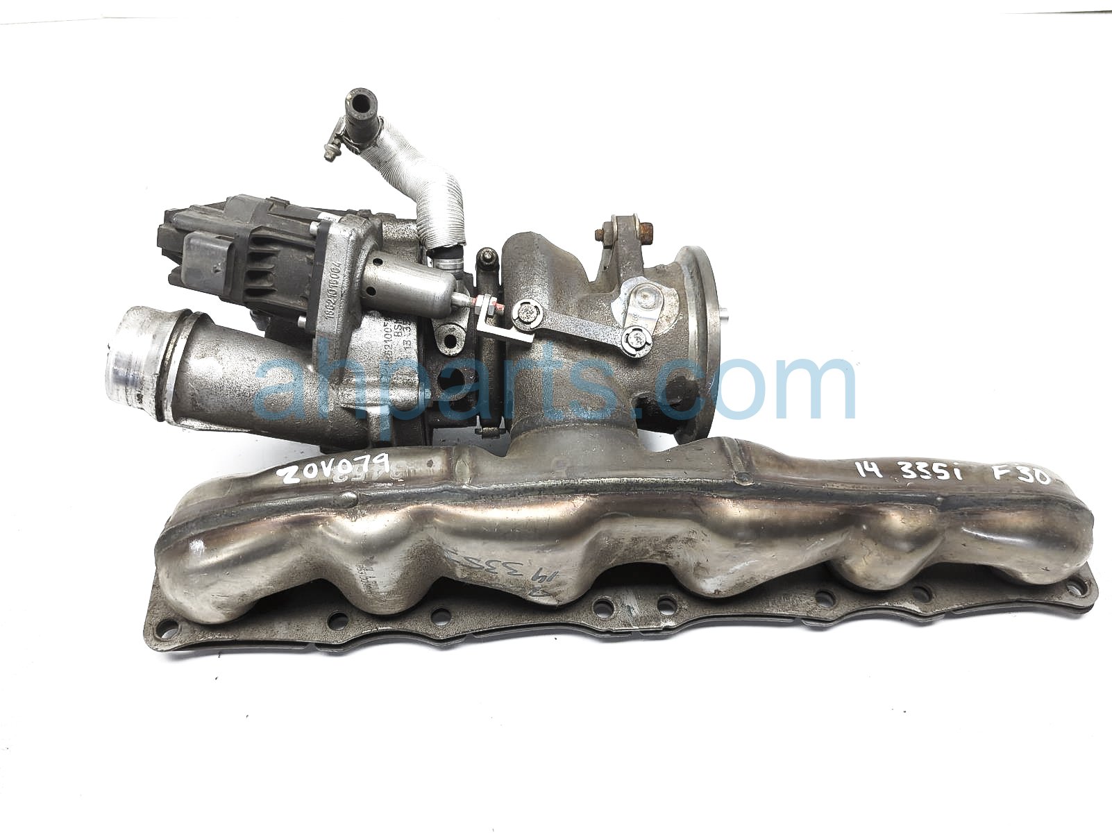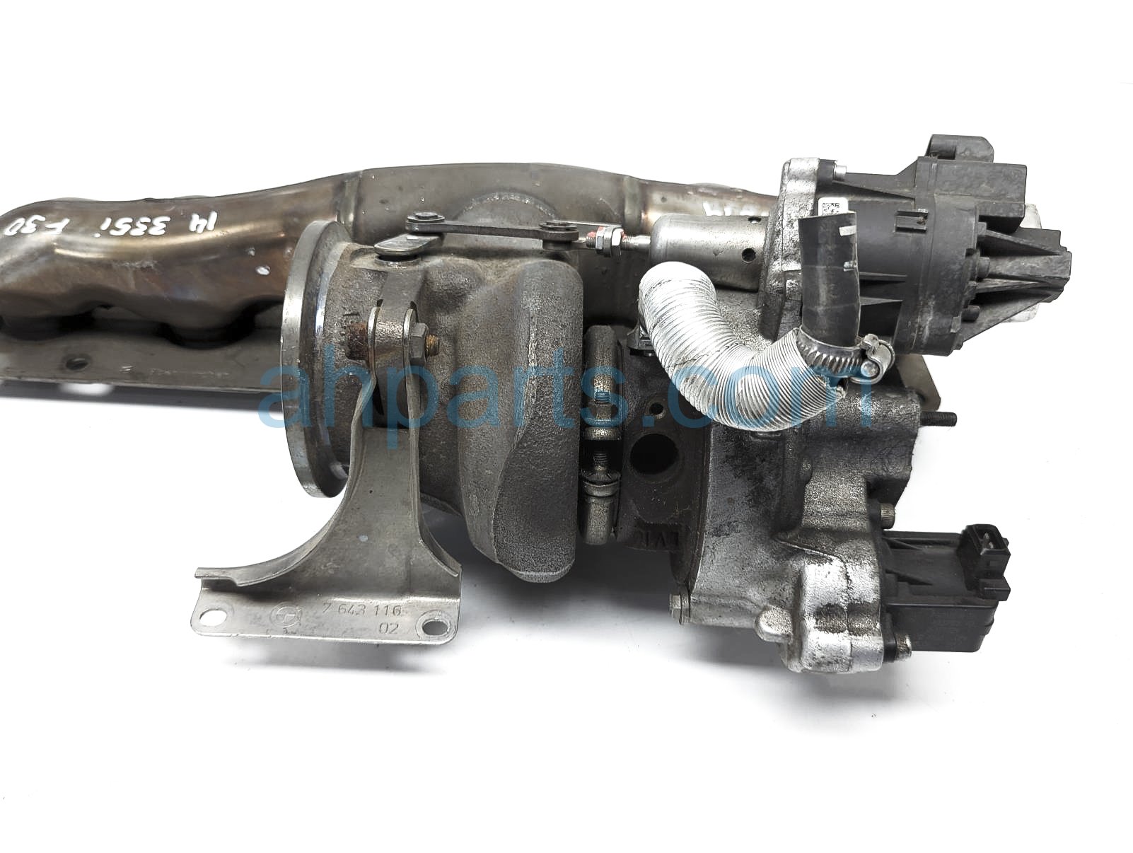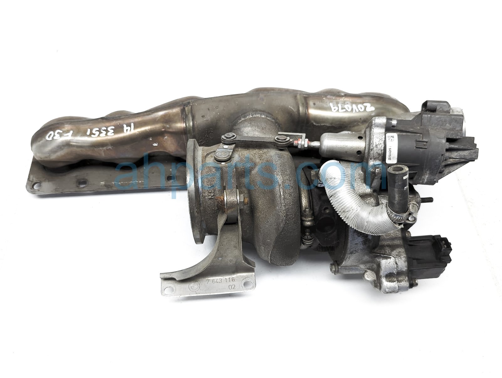 2014 BMW 335I turbocharger w/exhaust assy is a used item with a 1 year warranty. This OEM replacement turbocharger w/exhaust assy is genuine and has part numbers 11-65-7-636-424, and 11657636424. This BMW part sells for $350.