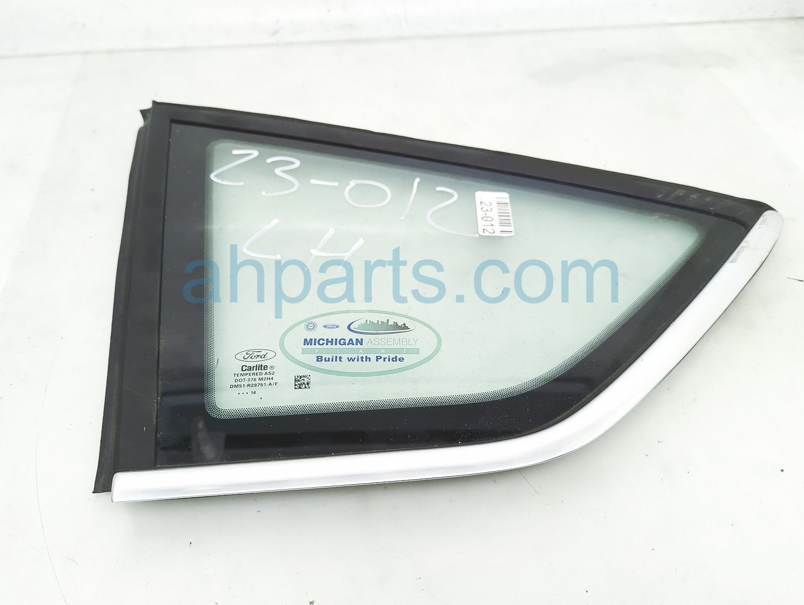 2014 Ford C-MAX driver quarter window glass is a used item with a 1 year warranty. This OEM replacement driver quarter window glass is genuine and has part numbers DM51-R29751-A/F, DM51R29751A/F, GM5Z-5829711-D, and GM5Z5829711D. This Ford part sells for $75.