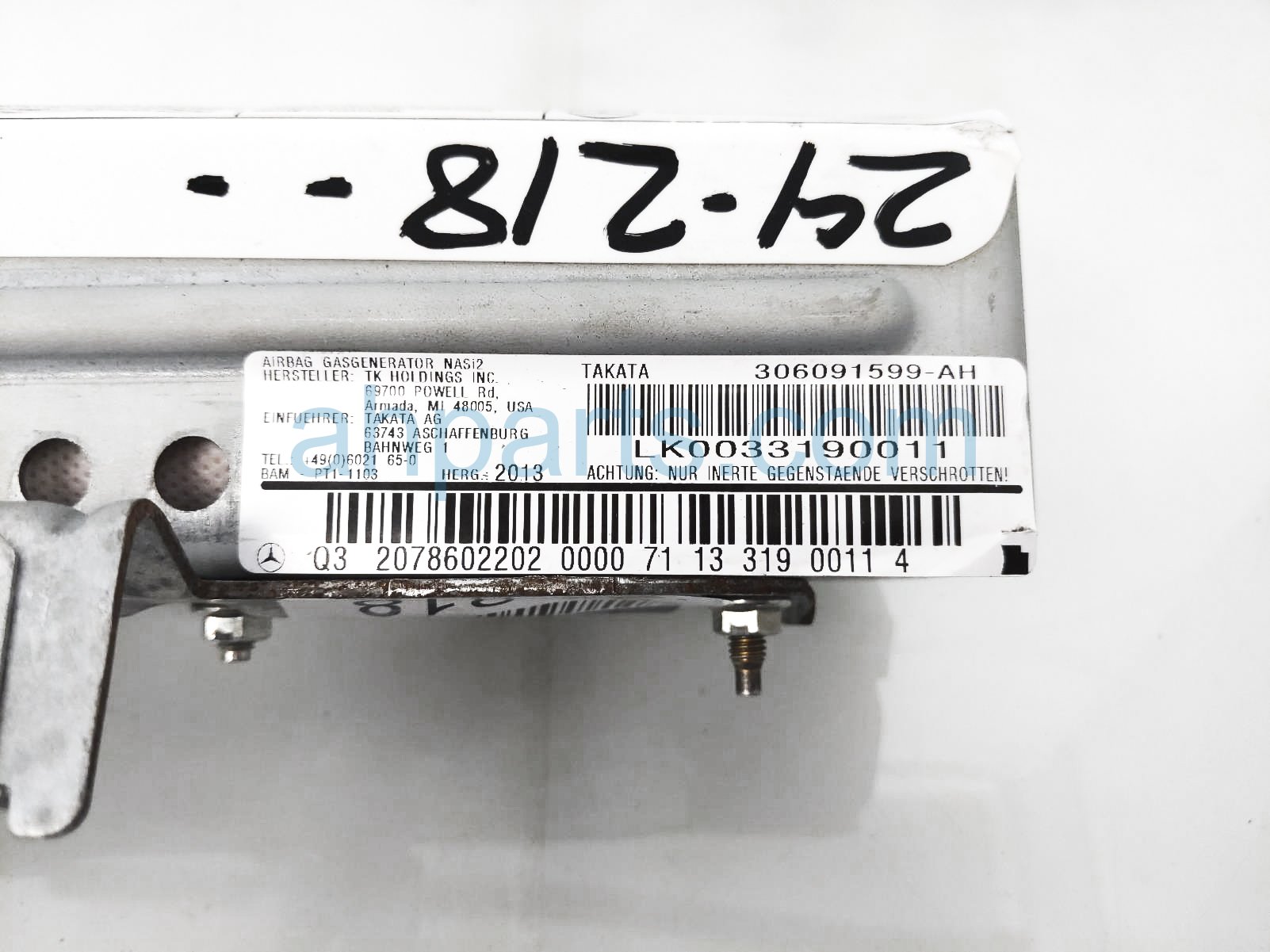2014 Mercedes E350 airbag rear passenger seat air bag is a used item with a 1 year warranty. This OEM replacement airbag rear passenger seat air bag is genuine and has part numbers 207-860-22-02, and 2078602202. This Mercedes part sells for $100.