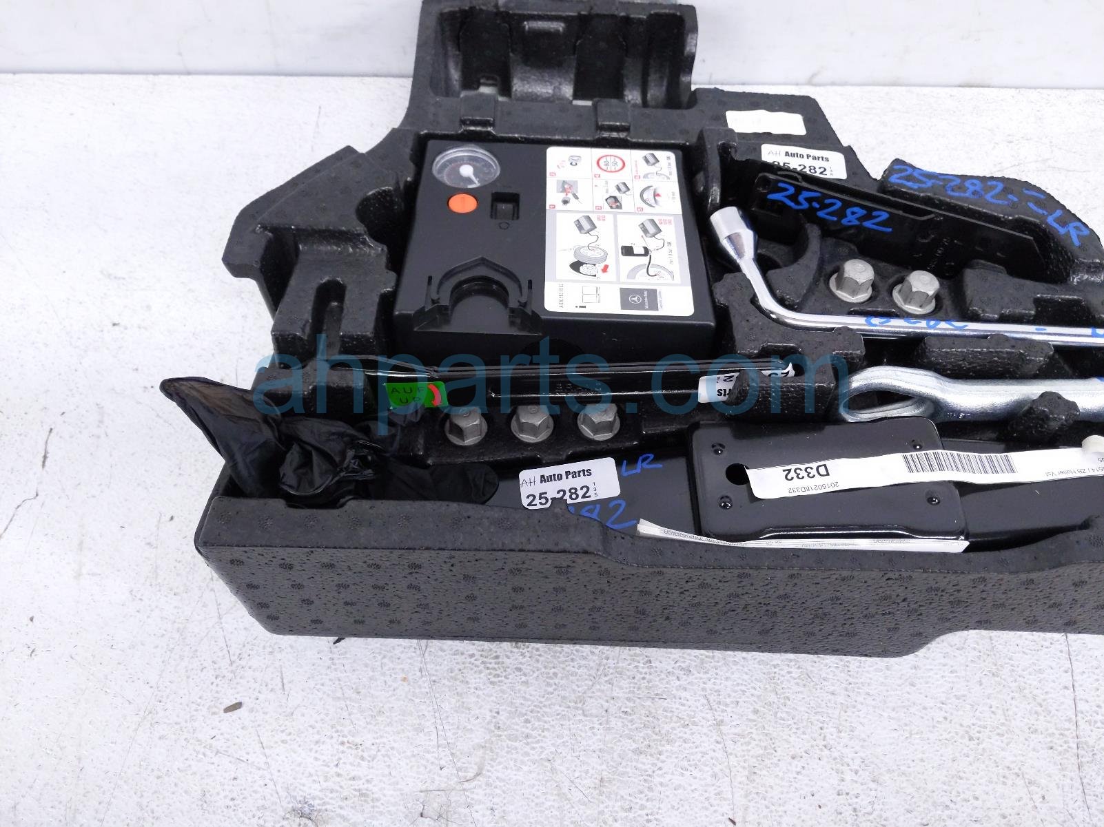 2015 Mercedes GLK350 jack & tools w/foam holder +inflator is a used item with a 1 year warranty. This OEM replacement jack & tools w/foam holder +inflator is genuine and has part numbers 204-898-29-15-9051, 20489829159051, 164-580-01-18, 1645800118, 000-583-13-02, and 0005831302. This Mercedes part is for sale (please call for pricing).