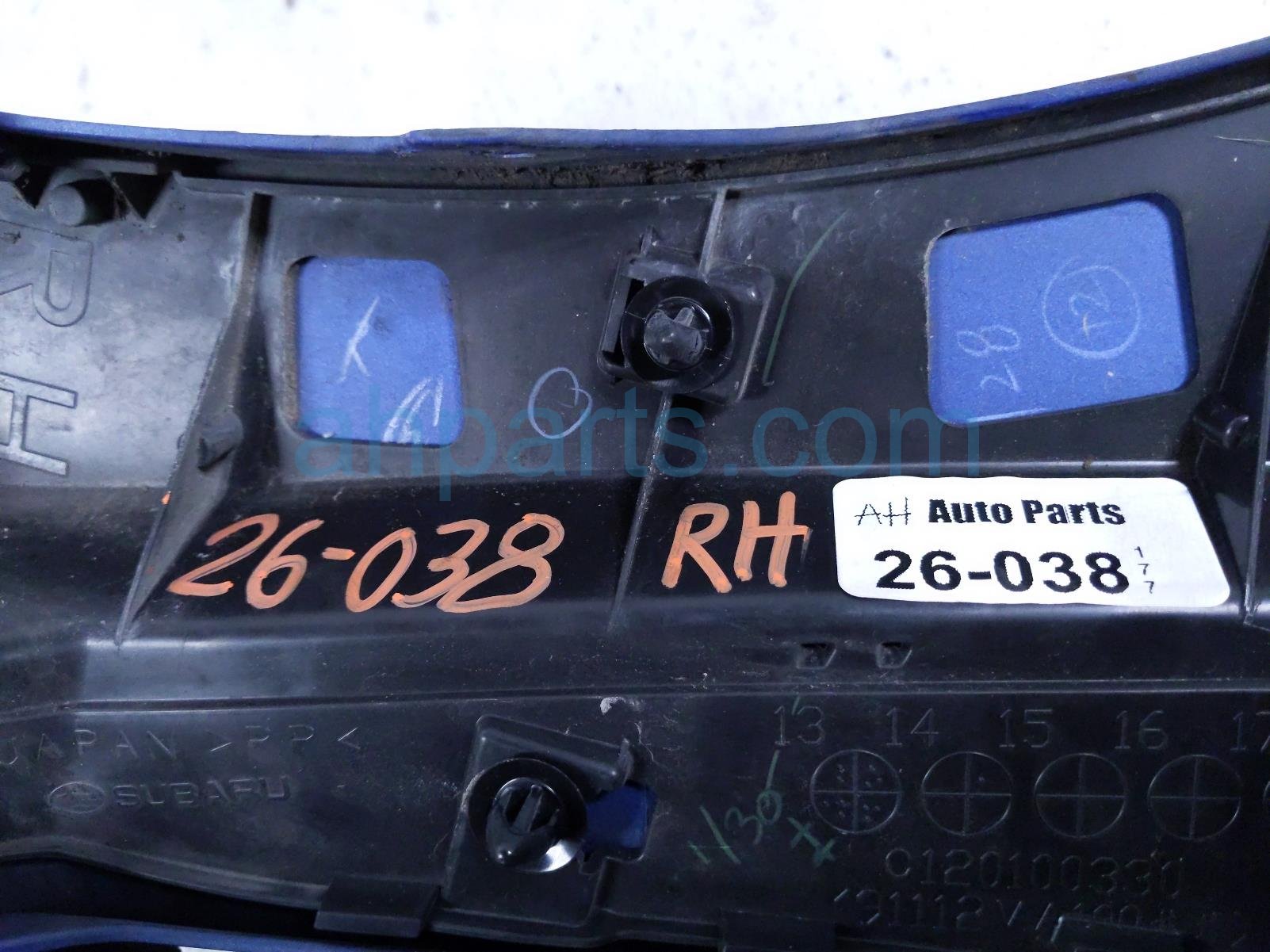 2015 Subaru WRX front passenger fender flare - blue is a used item with a 1 year warranty. This OEM replacement front passenger fender flare - blue is genuine and has part numbers 91112VA101NN. This Subaru part is for sale (please call for pricing). This item has the following note: 'This item has a slight scuff.'