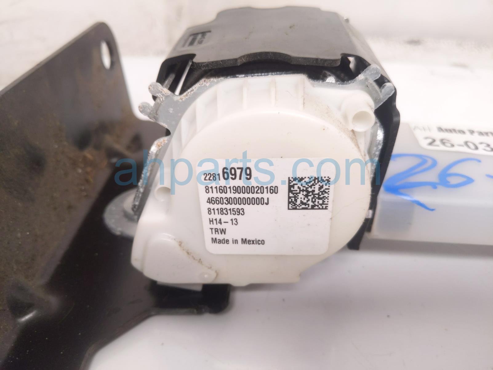 2016 Chevy Silverado 1500 rear mid seat belt retractor - grey is a used item with a 1 year warranty. This OEM replacement rear mid seat belt retractor - grey is genuine and has part numbers 84599977. This Chevy part is for sale (please call for pricing). This item has the following note: 'This item has some mold stains.'