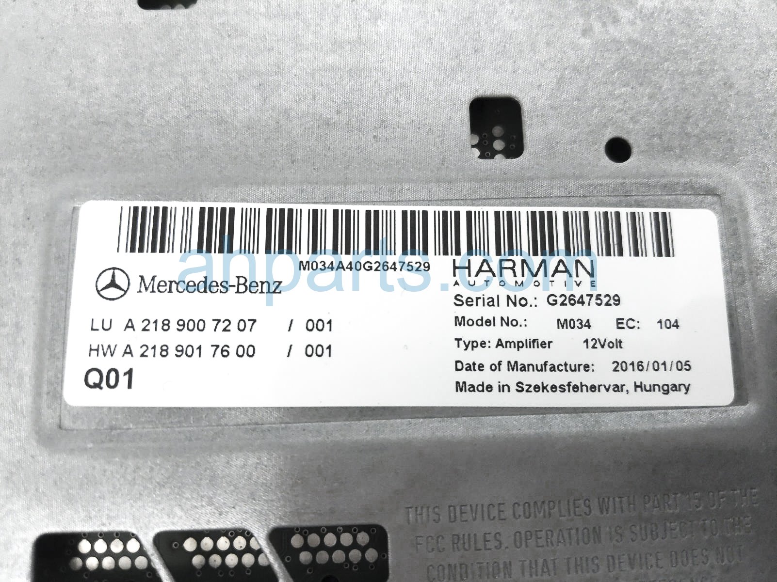 2016 Mercedes GLA250 audio amplifier unit is a used item with a 1 year warranty. This OEM replacement audio amplifier unit is genuine and has part numbers 218-900-72-07, and 2189007207. This Mercedes part sells for $399.