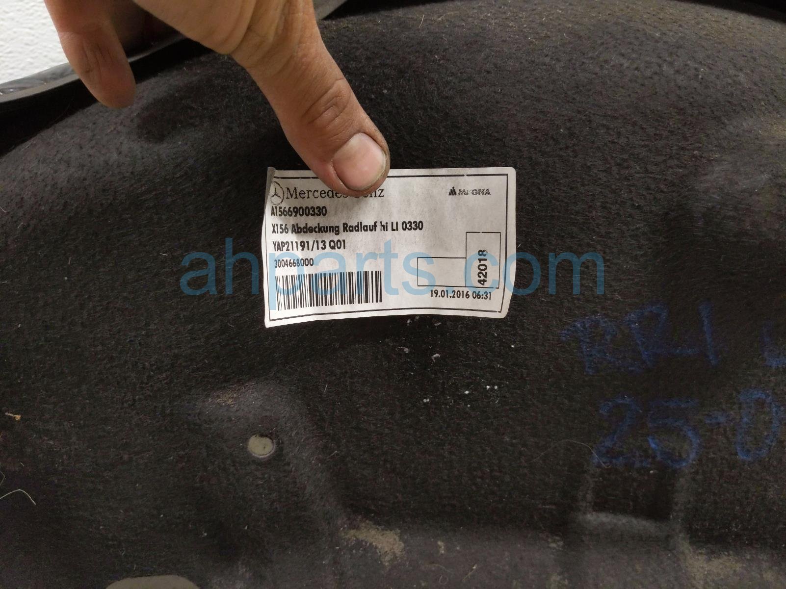 2016 Mercedes GLA250 rear driver inner fender liner is a used item with a 1 year warranty. This OEM replacement rear driver inner fender liner is genuine and has part numbers 156-690-03-30, and 1566900330. This Mercedes part sells for $75.
