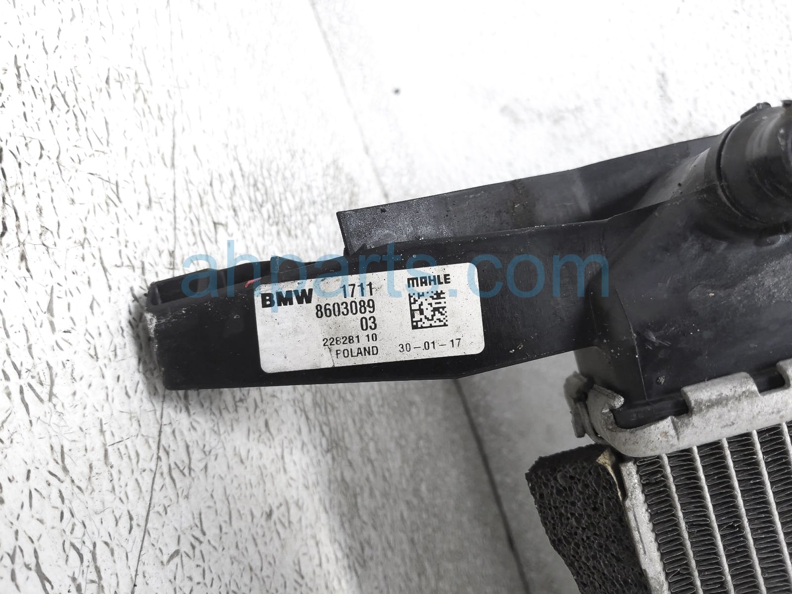 2017 BMW Mini Cooper radiator unit - 2.0l john cooper m.t is a used item with a 1 year warranty. This OEM replacement radiator unit - 2.0l john cooper m.t is genuine and has part numbers 17-11-8-603-089, and 17118603089. This BMW part sells for $250. This item has the following note: 'This item has some bent fins - grade b.'