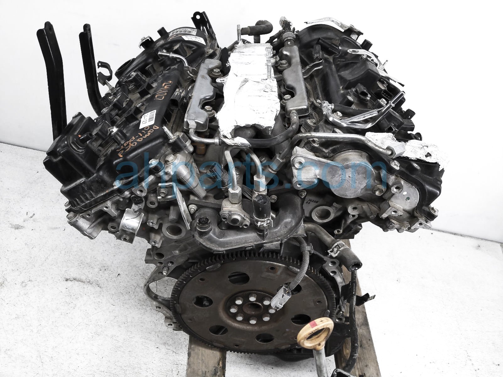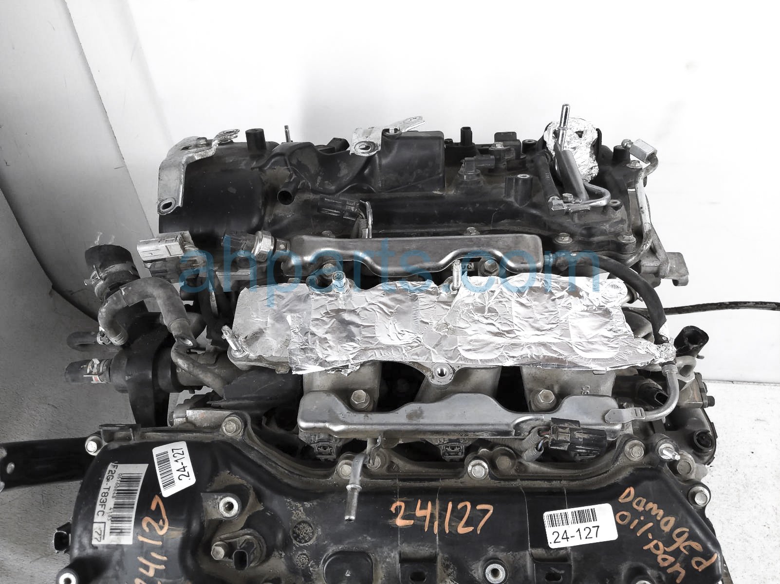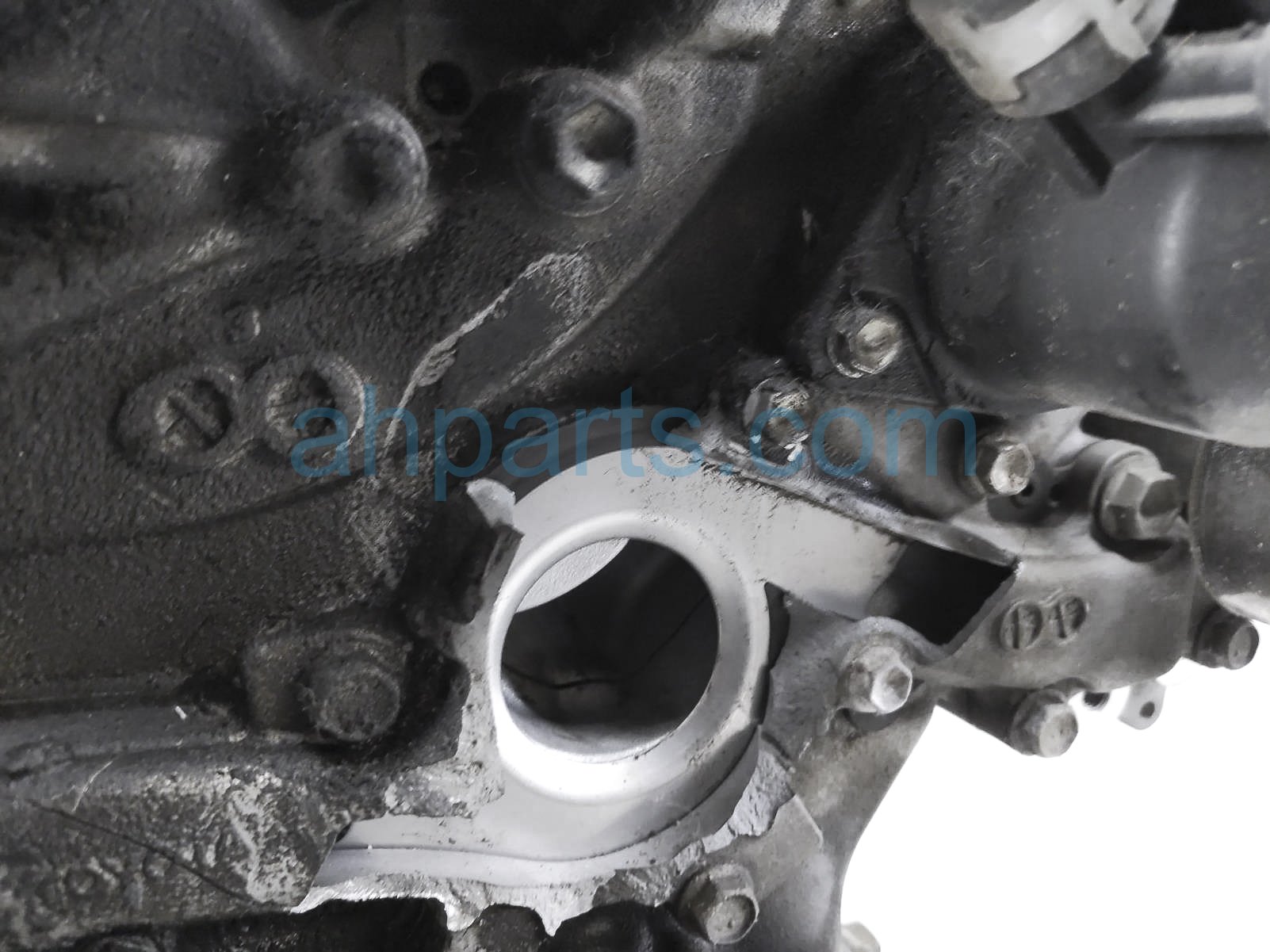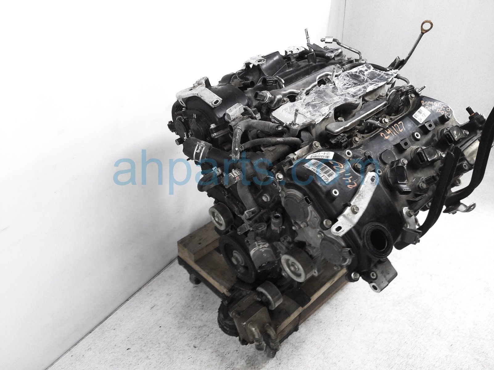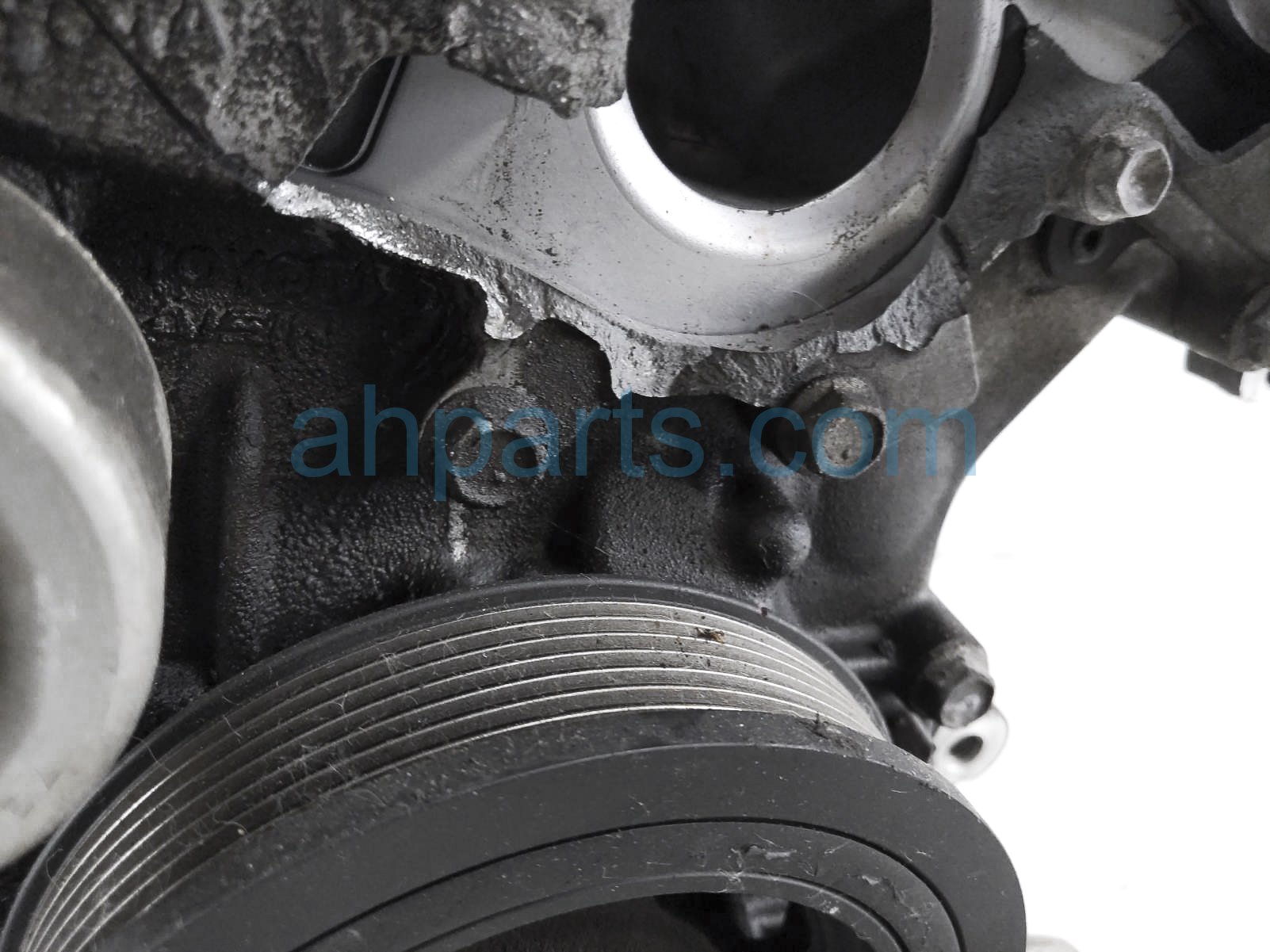 This item has the following note: 'Timing chain cover needs to be replaced (cracked behind water pump), lower oil pan is damaged, front timing sensors broken - grade c.'