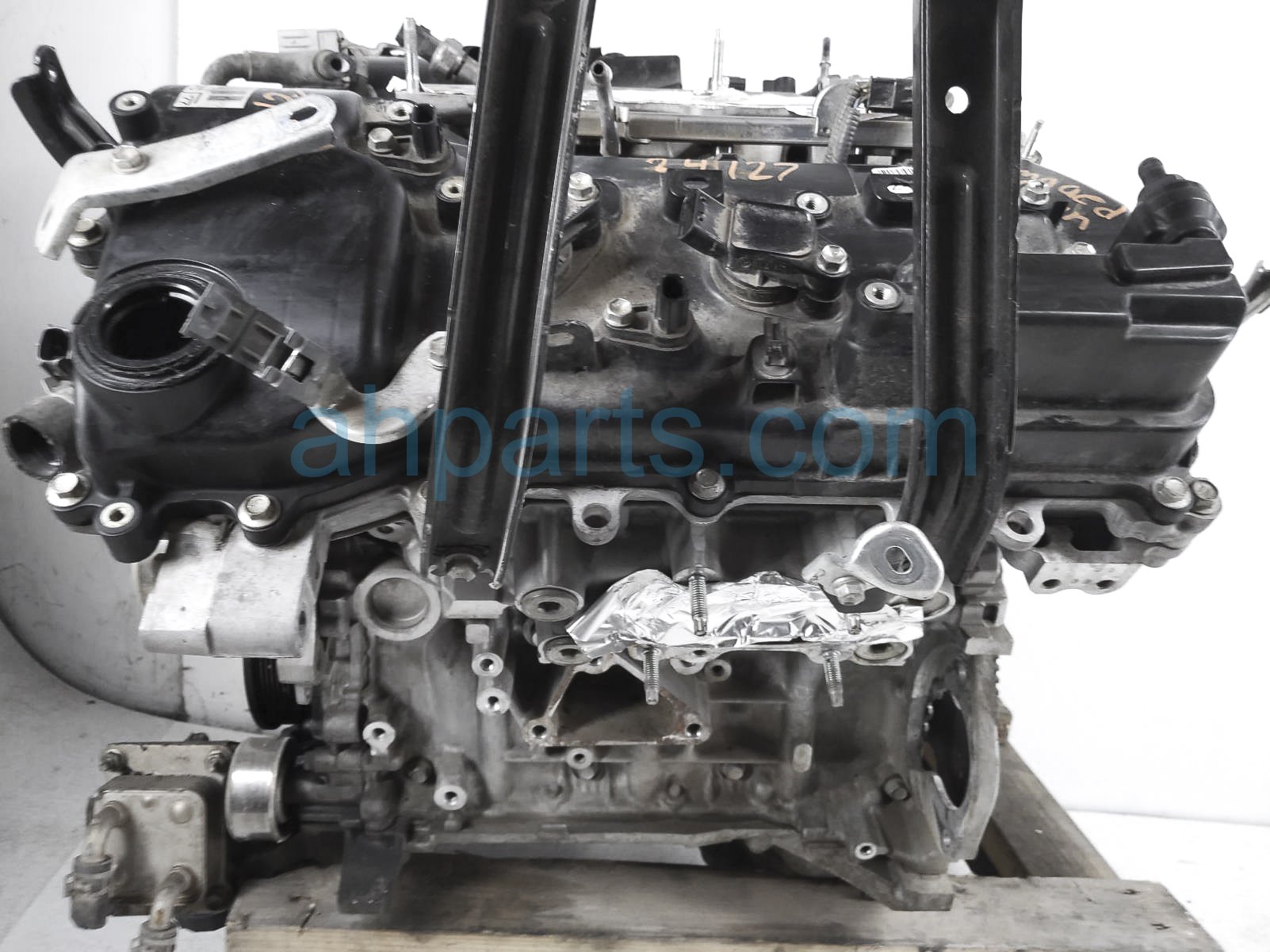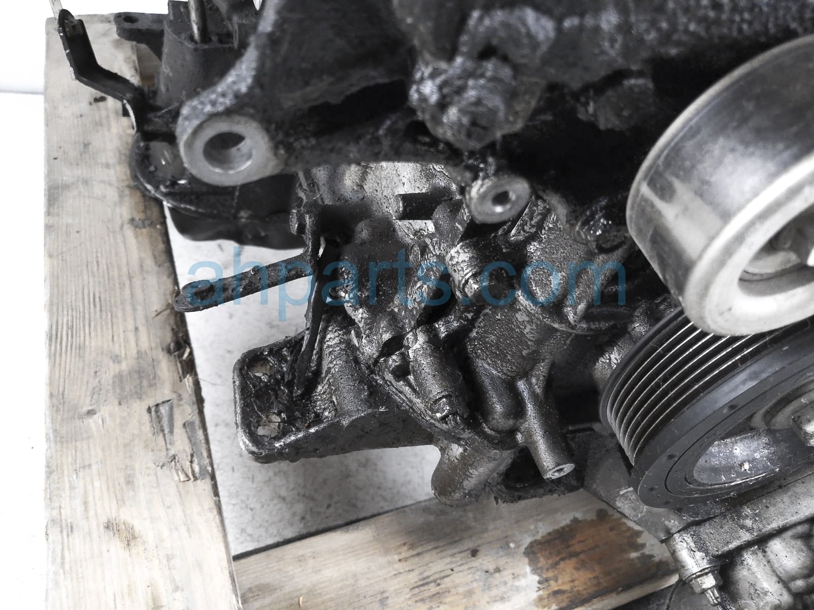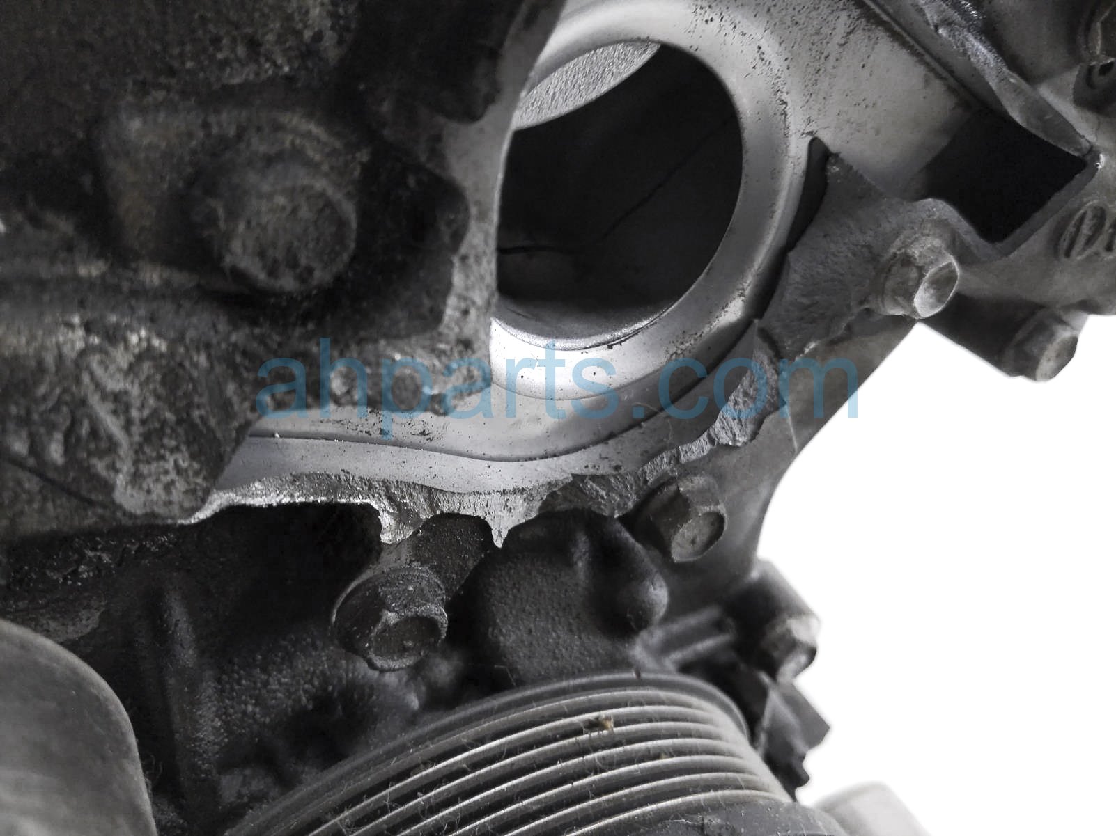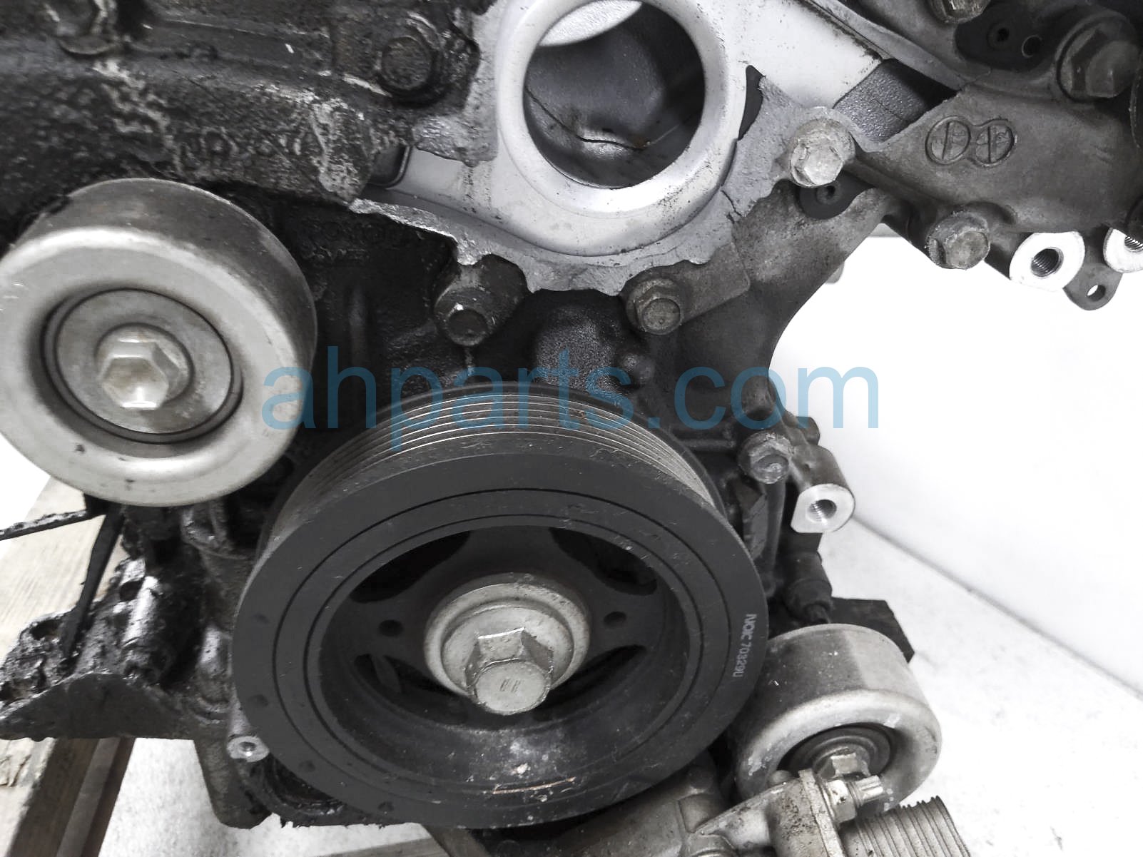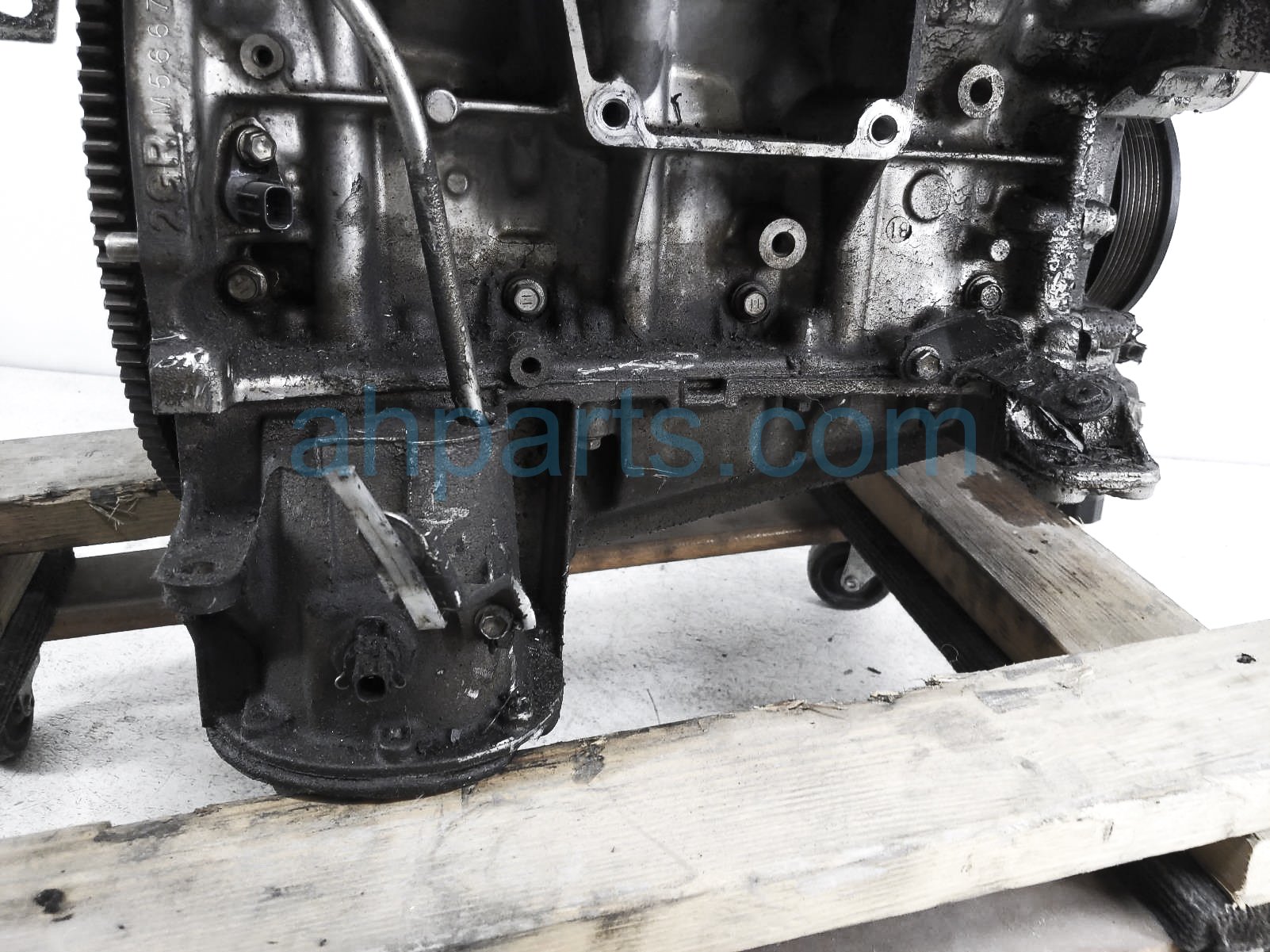 This item has the following note: 'Timing chain cover needs to be replaced (cracked behind water pump), lower oil pan is damaged, front timing sensors broken - grade c.'