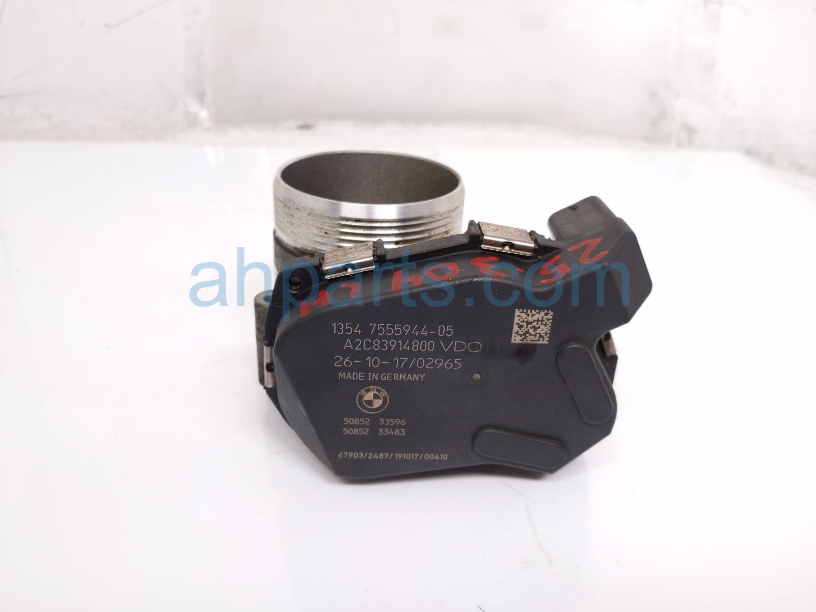 2018 BMW X5 driver throttle body is a used item with a 1 year warranty. This OEM replacement driver throttle body is genuine and has part numbers 13-54-7-555-944, and 13547555944. This BMW part sells for $75.