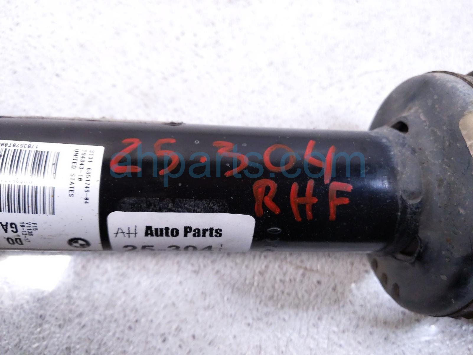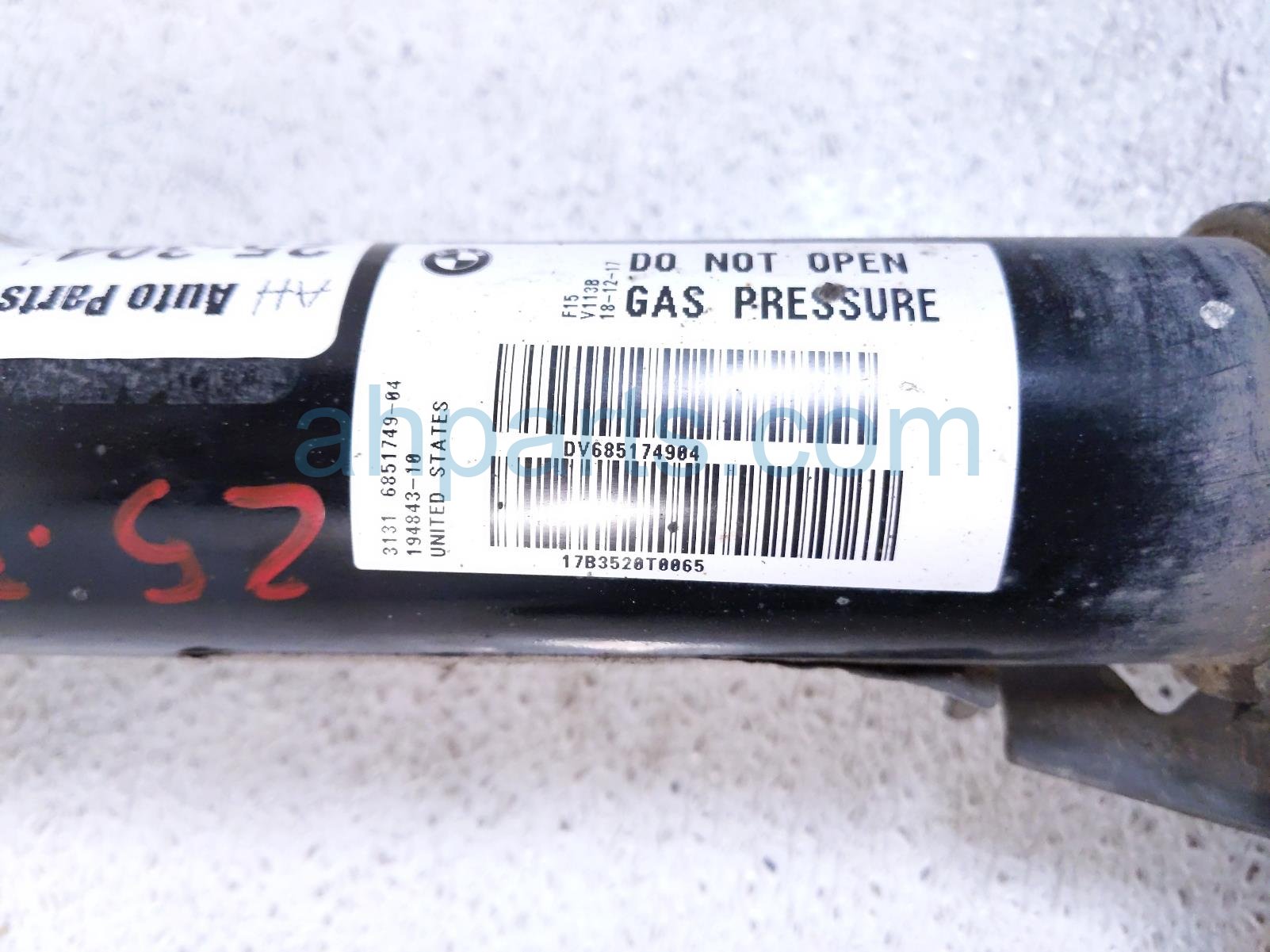 2018 BMW X5 front passenger strut absorber + spring is a used item with a 1 year warranty. This OEM replacement front passenger strut absorber + spring is genuine and has part numbers 31-12-6-851-592, 31126851592, 31-31-6-851-749, 31316851749, 31-30-6-851-879, and 31306851879. This BMW part sells for $149.