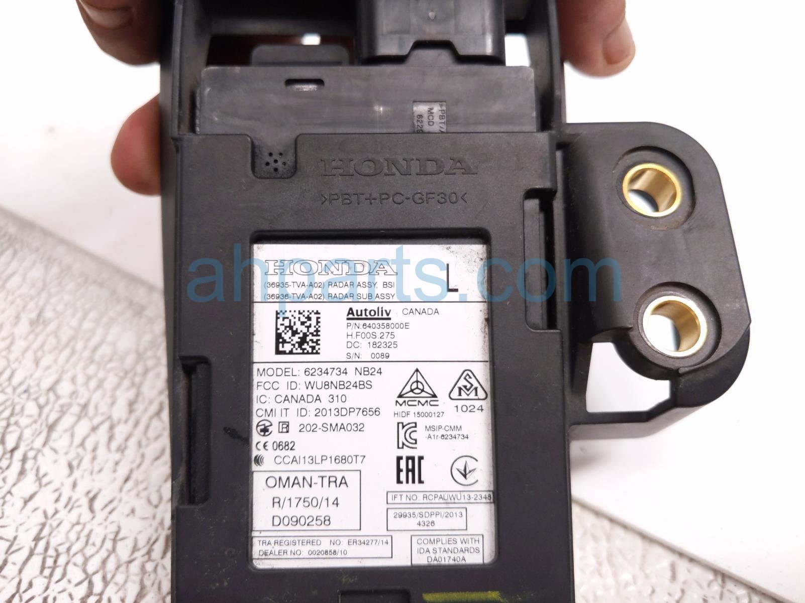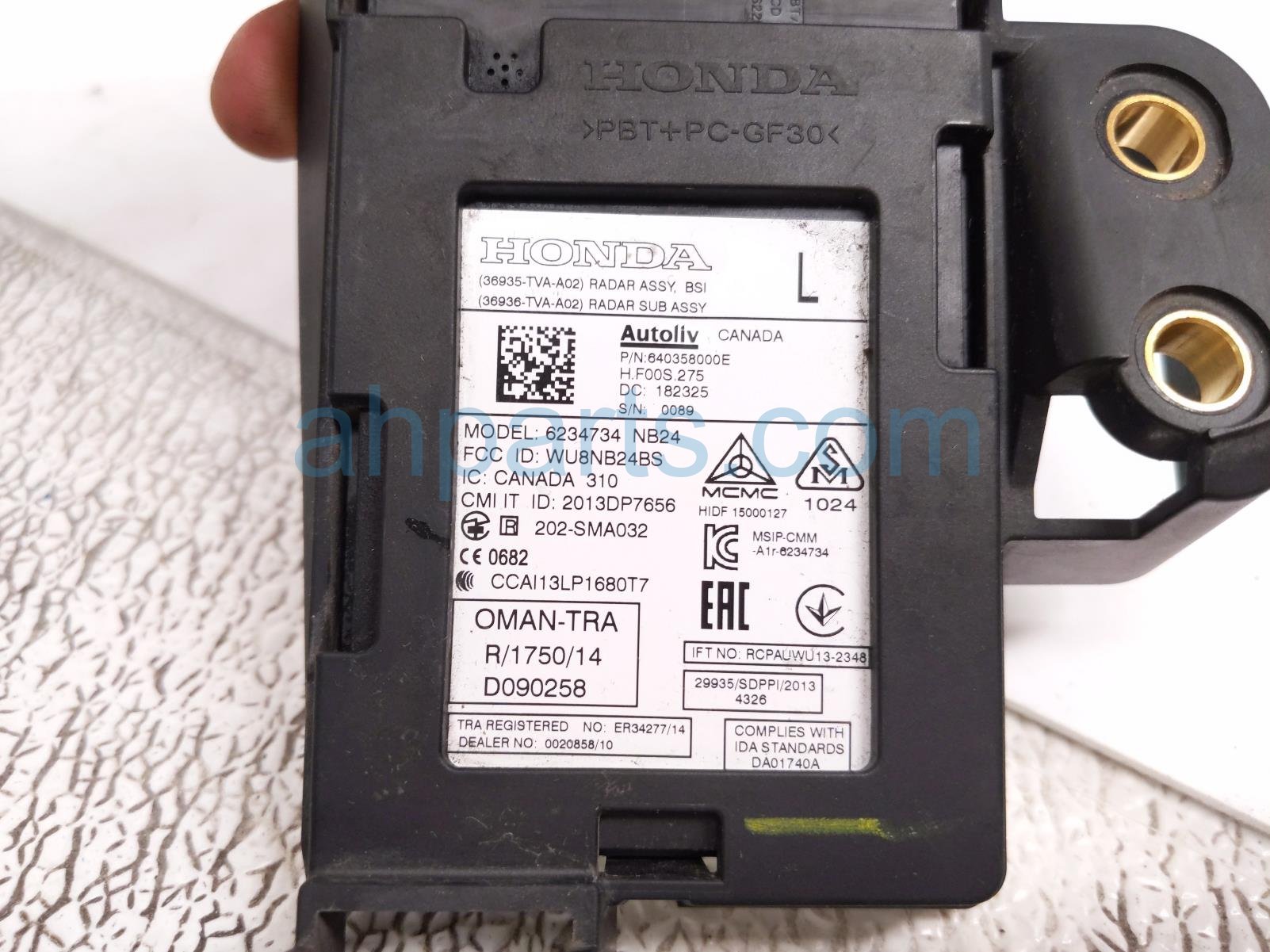 2018 Honda Accord rear driver blind spot radar w/bracket is a used item with a 1 year warranty. This OEM replacement rear driver blind spot radar w/bracket is genuine and has part numbers 36936-TVA-A02, 36936TVAA02, 36937-TVA-A01, and 36937TVAA01. This Honda part sells for $125.