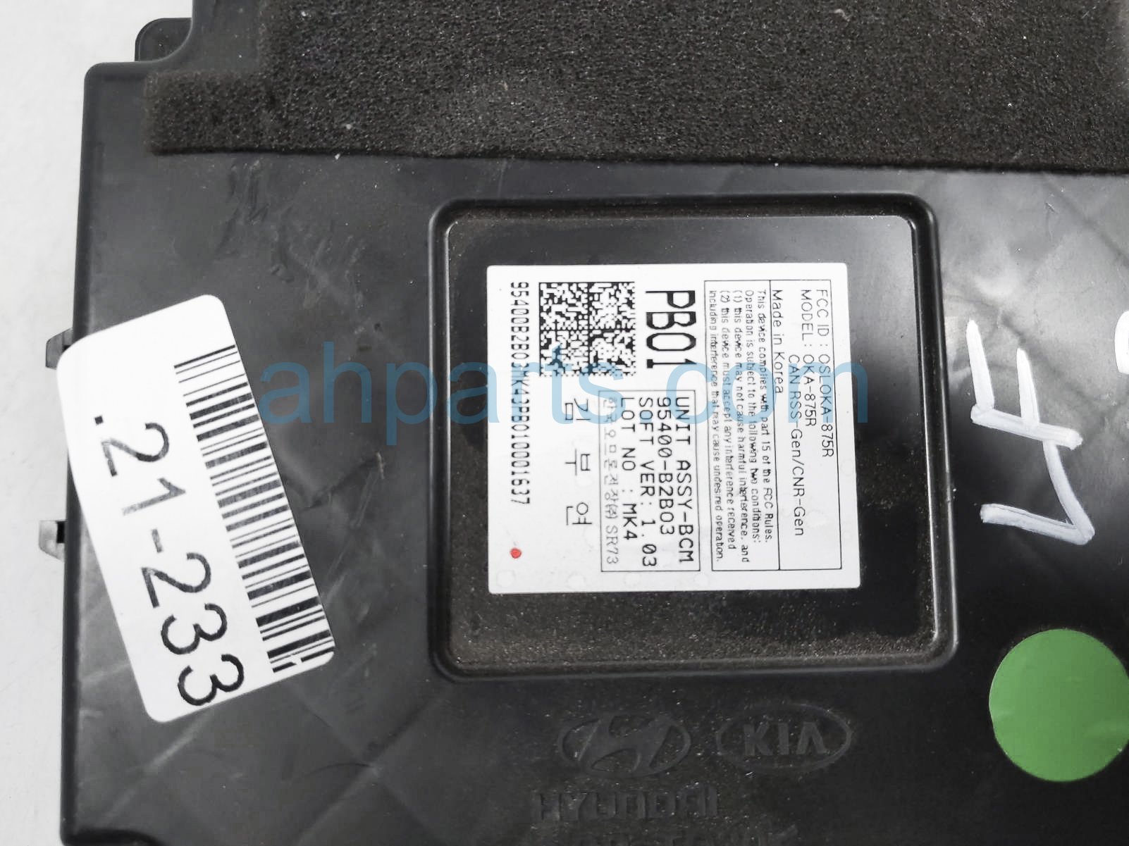 2018 Kia Soul body control module unit (bcm) is a used item with a 1 year warranty. This OEM replacement body control module unit (bcm) is genuine and has part numbers 95400-B2BO3, and 95400B2BO3. This Kia part sells for $49.
