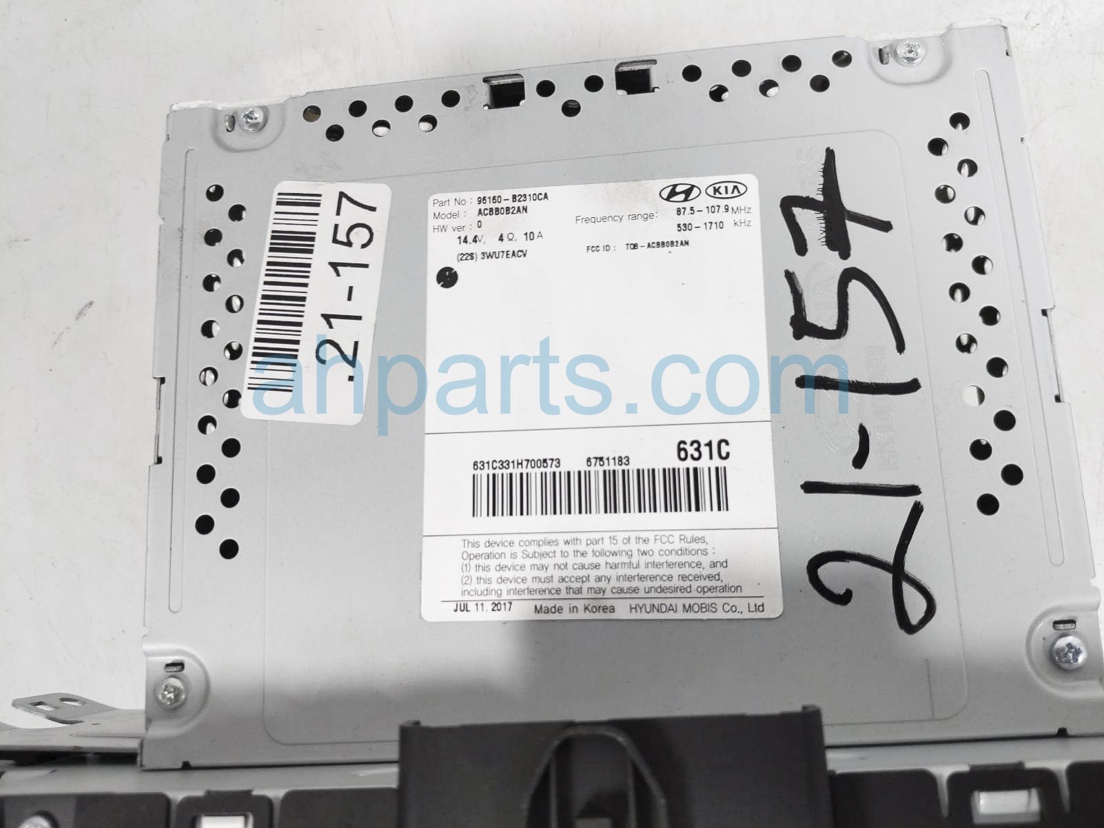 2018 Kia Soul radio assembly w/o navi is a used item with a 1 year warranty. This OEM replacement radio assembly w/o navi is genuine and has part numbers 96160-B2310CA, and 96160B2310CA. This Kia part sells for $90. This item has the following note: 'Has minor scratches.'