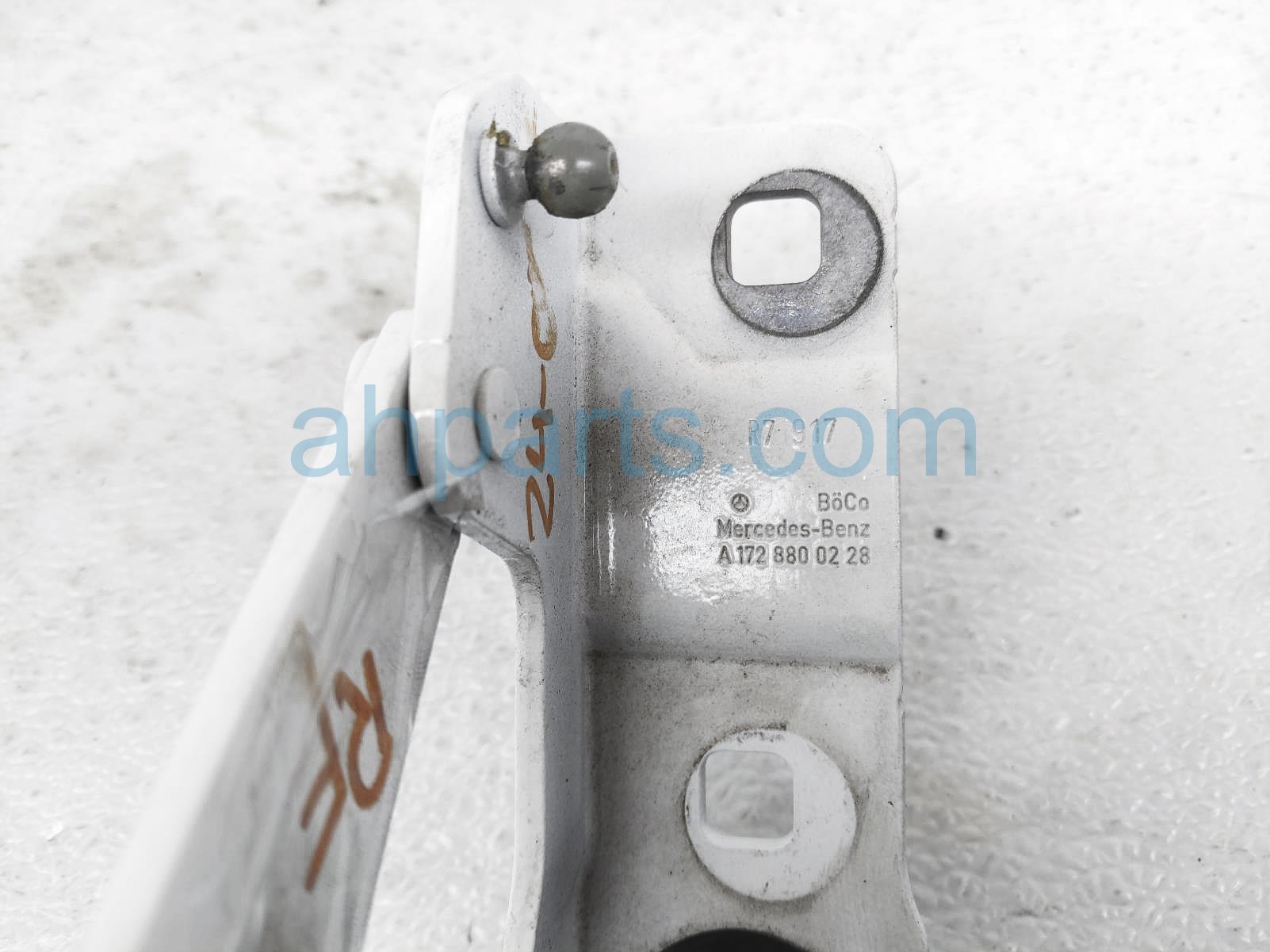 2018 Mercedes SLC43 front passenger hood hinge - white is a used item with a 1 year warranty. This OEM replacement front passenger hood hinge - white is genuine and has part numbers 172-880-02-28, and 1728800228. This Mercedes part sells for $25.