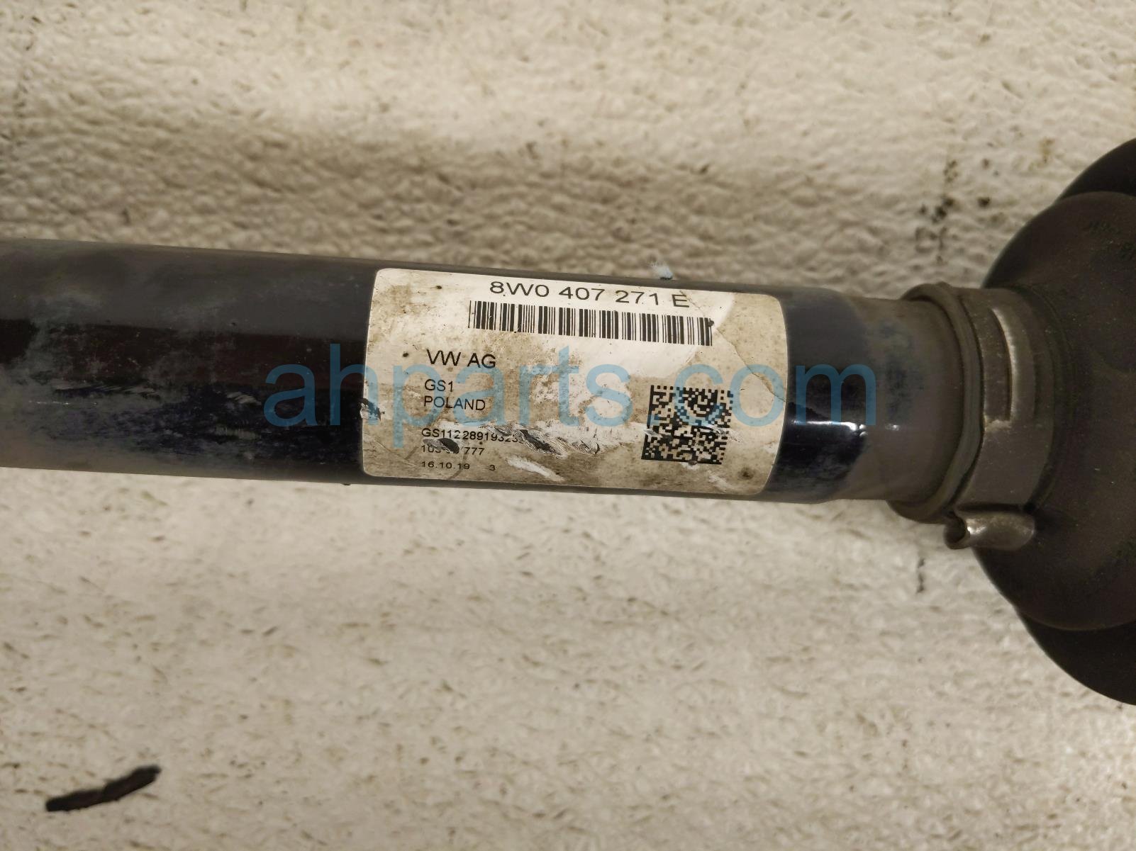 2019 Audi S5 Audi front driver cv axle drive shaft is a used item with a 1 year warranty. This OEM replacement front driver cv axle drive shaft is genuine and has part numbers 8W0-407-271-M, 8W0407271M, 8W0-407-271-E, and 8W0407271E. This Audi part is for sale (please call for pricing).