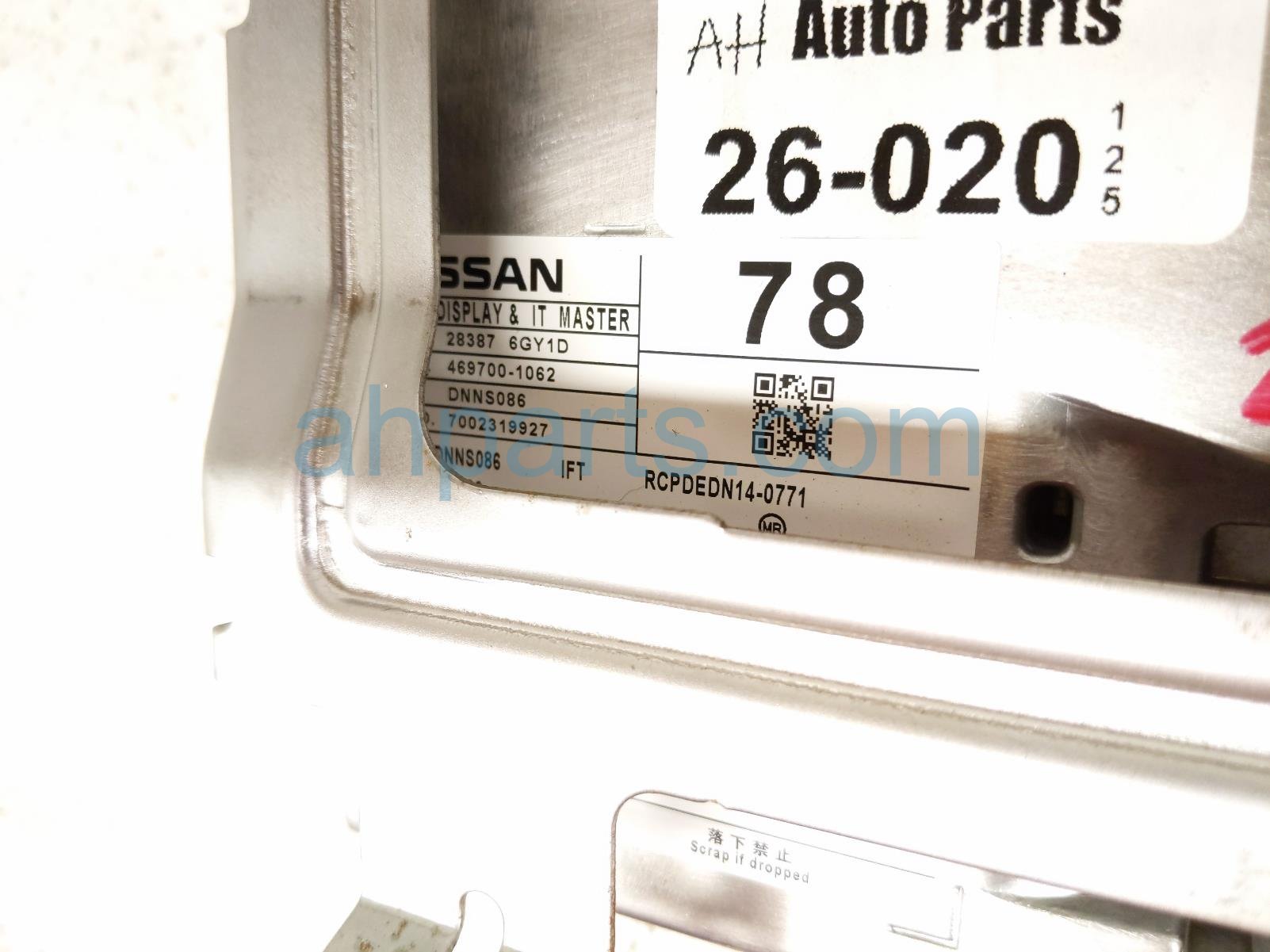 2019 Nissan Pathfinder upper display screen (non navi) is a used item with a 1 year warranty. This OEM replacement upper display screen (non navi) is genuine and has part numbers 28387-6GY1D, and 283876GY1D. This Nissan part is for sale (please call for pricing).