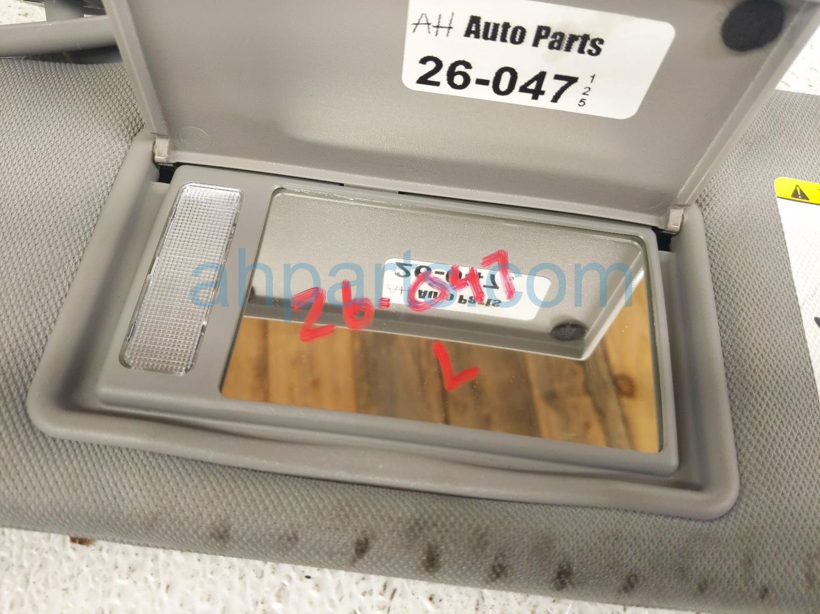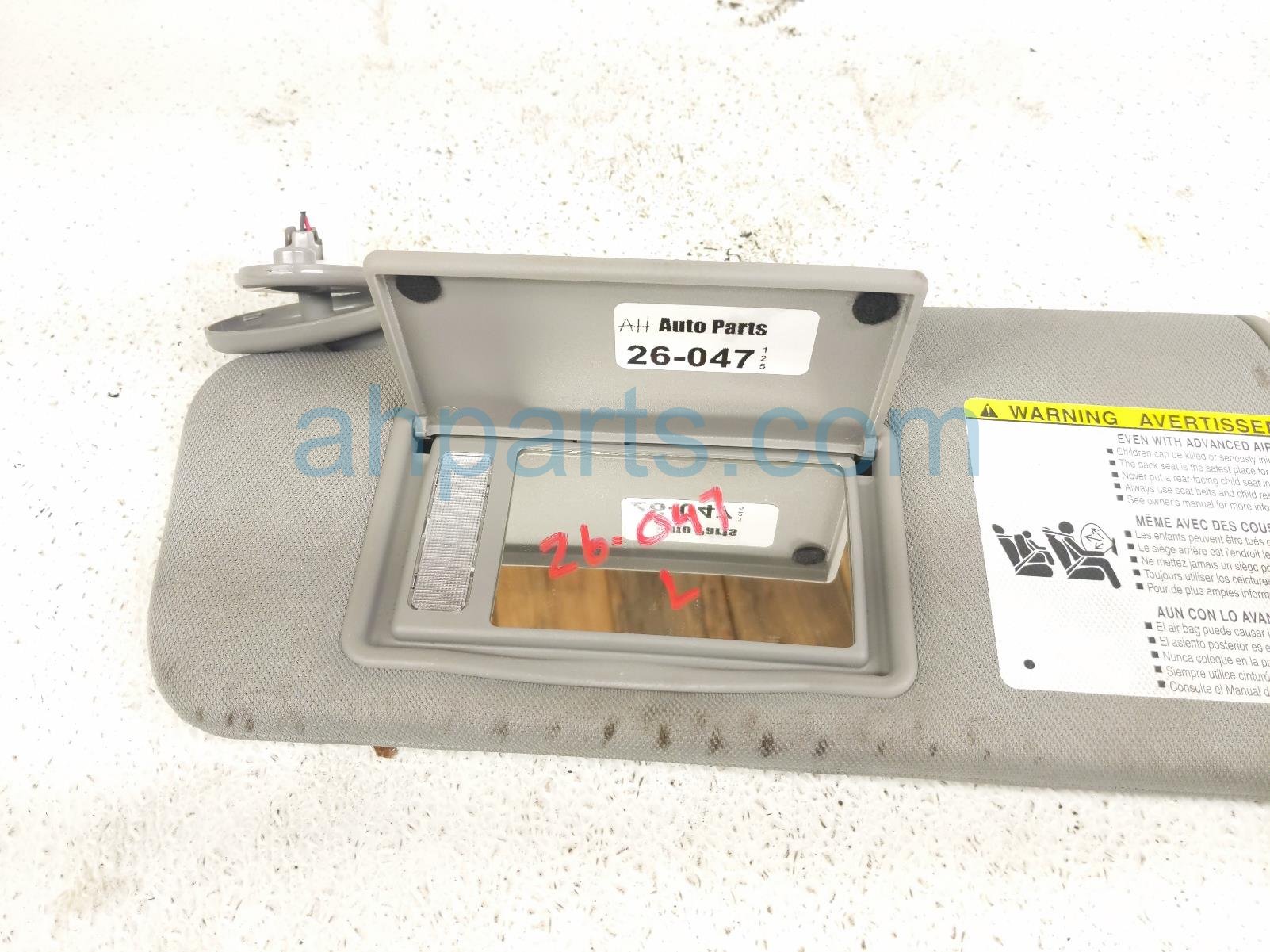 2019 Toyota Highlander driver sun visor - grey is a used item with a 1 year warranty. This OEM replacement driver sun visor - grey is genuine and has part numbers 74320-0E073-B0, and 743200E073B0. This Toyota part is for sale (please call for pricing). This item has the following note: 'This item is dirty and has some scuffs and some small stains.'