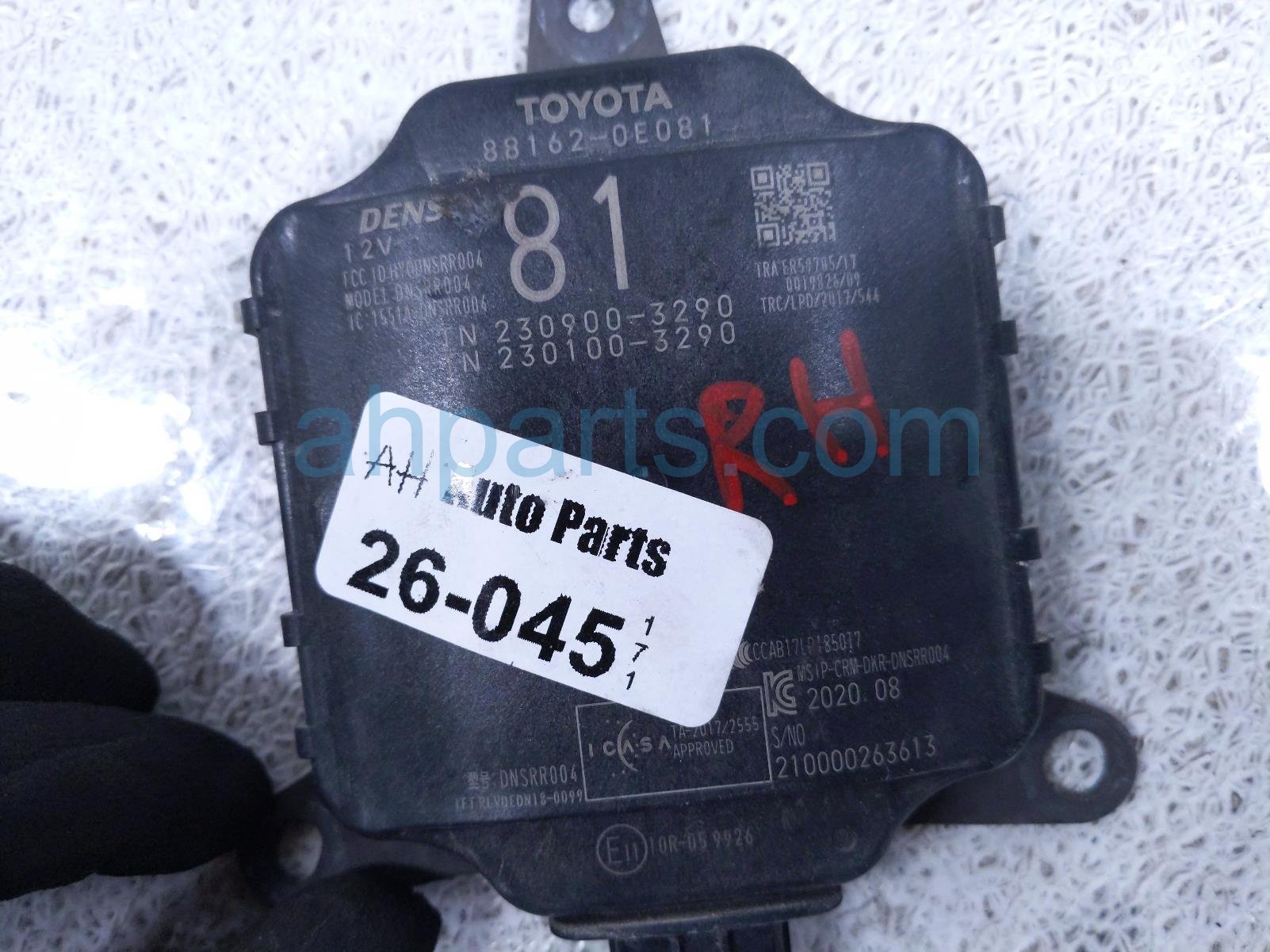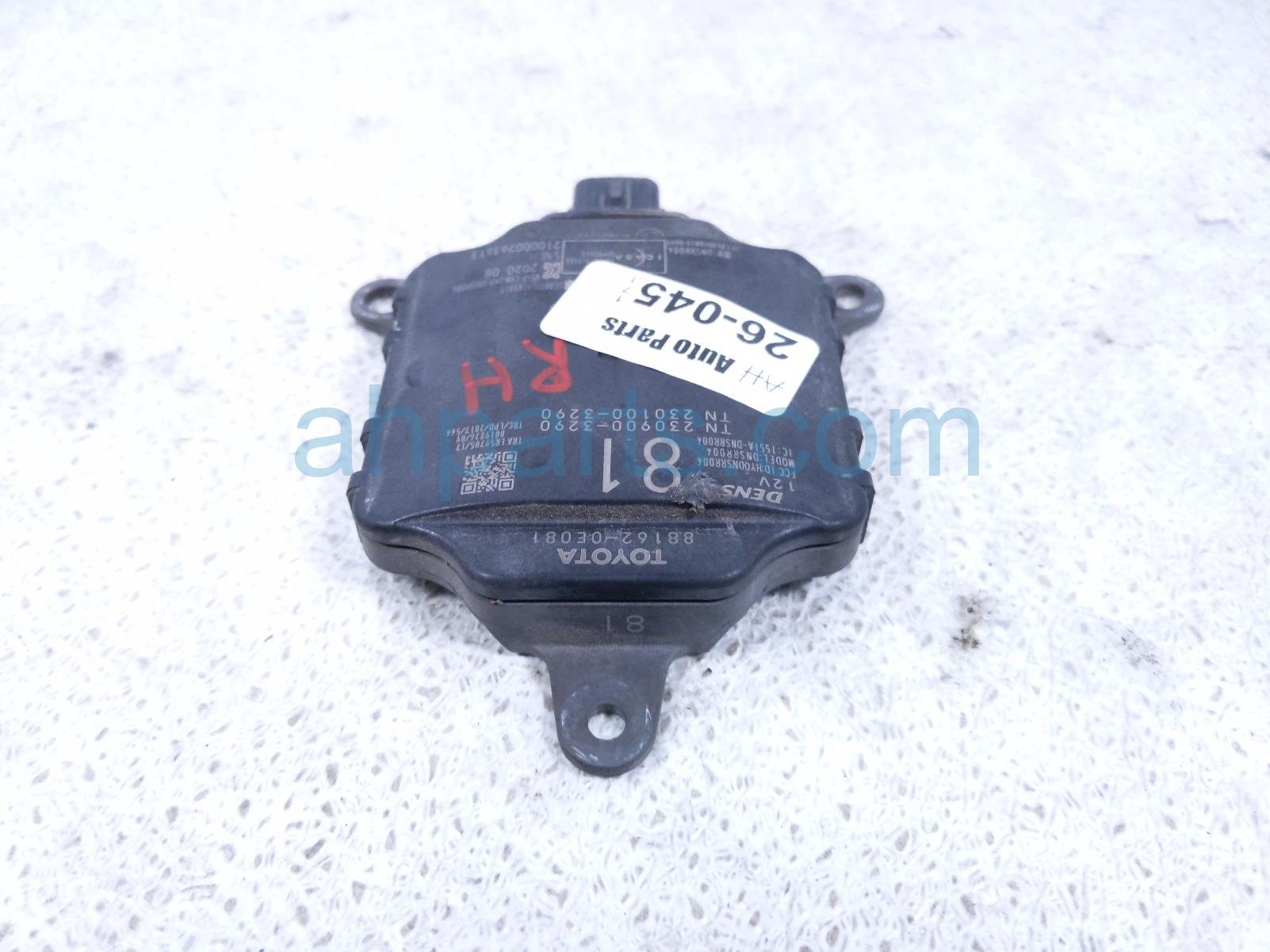 2020 Toyota Highlander rear passenger blind spot radar unit is a used item with a 1 year warranty. This OEM replacement rear passenger blind spot radar unit is genuine and has part numbers 88162-0E081, and 881620E081. This Toyota part is for sale (please call for pricing).